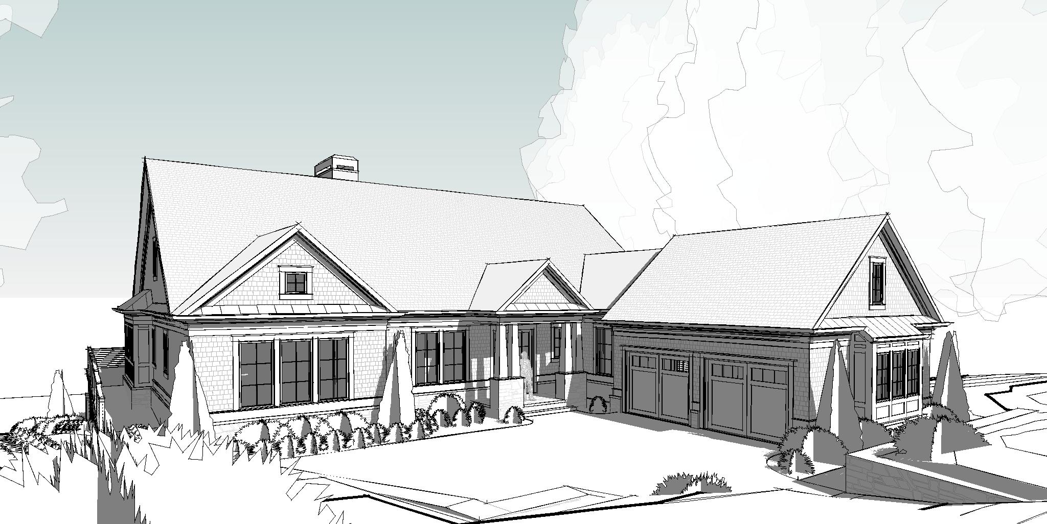 using the provided architectural drawing create a professional photorealistic architectural rendering keeping all of the architecture and details exactly the same applying the following materials and colors roof wood shake roof shingles shingle walls use nucedar shingle siding in the color argos trim a warm white color windows a warm white color stone base a random rubble pattern with a mixture of grays and browns add trees to the background make the chimney caps a dark bronze color and make the metal roof accents a dark bronze metal color