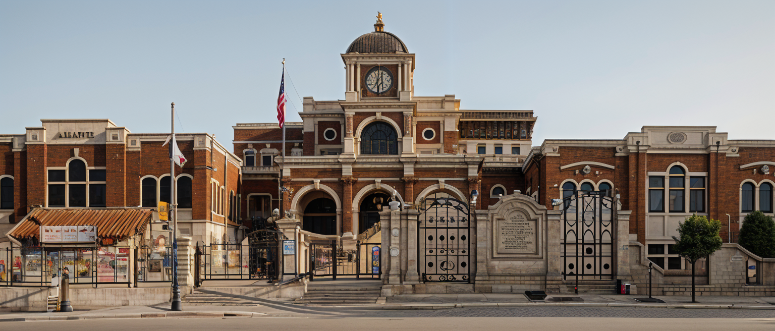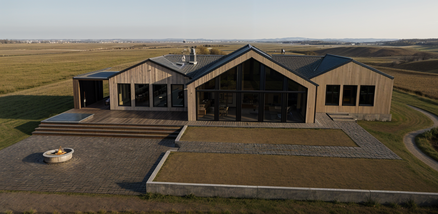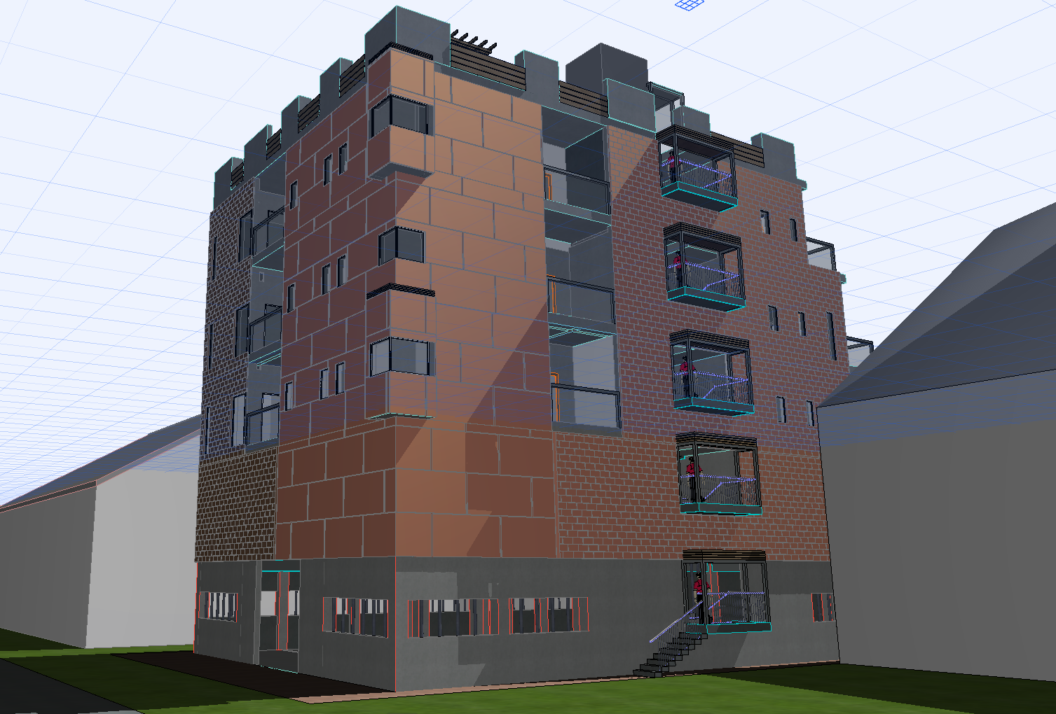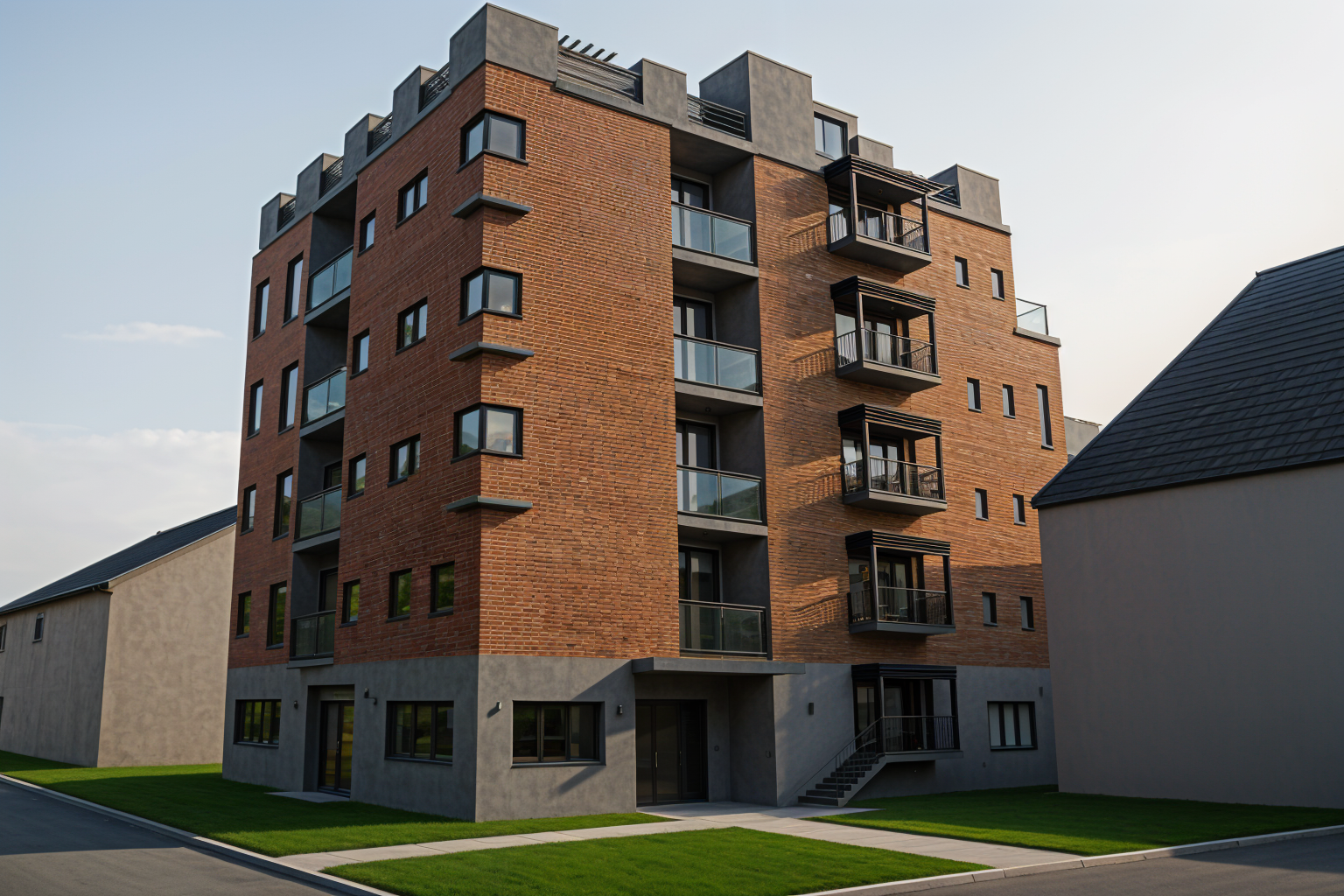 render a modern five story urban building with a contemporary design the exterior features a mix of brown brick and smooth earth toned panels balconies with sleek glass railings add elegance the lower level is a dark concrete gray accentuate the windows with black frames the setting is a vibrant afternoon casting warm golden sunlight on the structure creating dynamic shadows surroundings hint at a green urban environment with neatly manicured grass add a clear blue sky above creating a clean and peaceful atmosphere