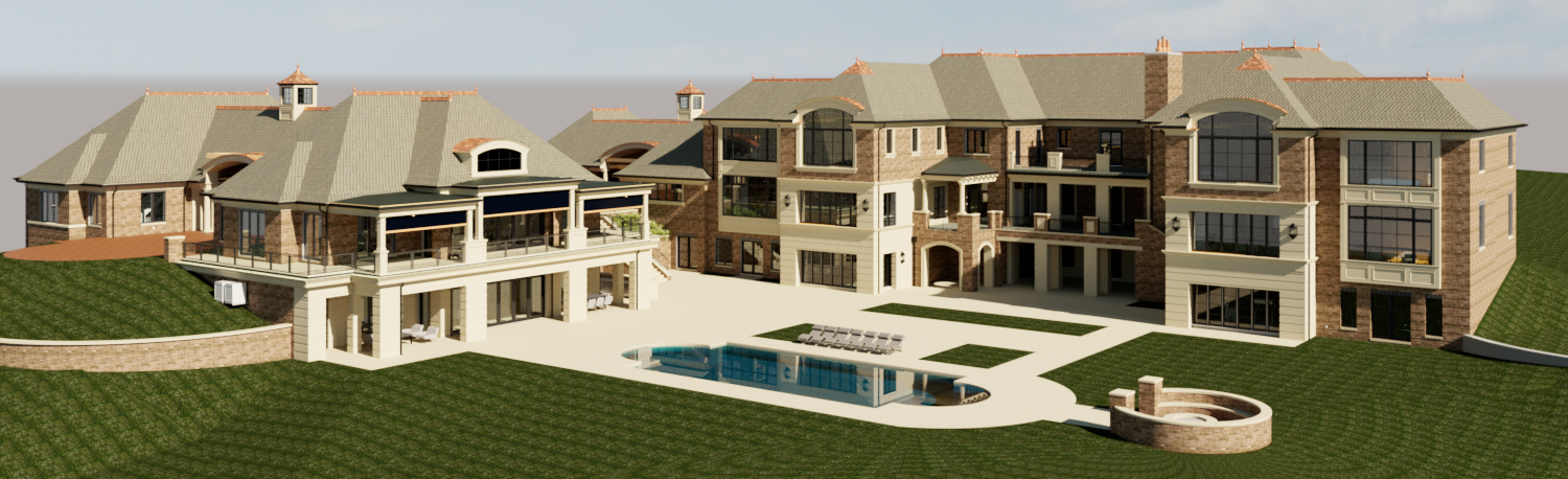 render a high quality photorealistic exterior 3d view directly from the provided revit model absolute requirement preserve all existing architecture massing geometry openings proportions and material boundaries exactly as modeled hardscape septic constraint critical pool deck and hardscape outline footprint size and geometry must remain exactly as modeled no expansion reshaping or reconfiguration of hardscape areas pool add realistic water only within the existing pool geometry no changes to pool shape edge condition or elevation landscaping allowed restrained add tasteful realistic landscaping appropriate for a high end residential setting use lawn areas low shrubs ornamental grasses and limited trees landscaping may occur in yard areas and green spaces including those shown within the pool deck do not encroach into hardscape areas or alter grades keep planting intentional clean edged and not overgrown landscaping should frame and support the architecture not dominate it pool deck hardscape finish only improve realism of existing deck surface finish only maintain existing layout and implied jointing roofing primary roofs architectural asphalt shingles as modeled copper roof elements remain copper exactly as shown masonry locked lower veneer smooth honed travertine with recessed reveals upper veneer brick veneer exactly as modeled no material substitution no pattern changes