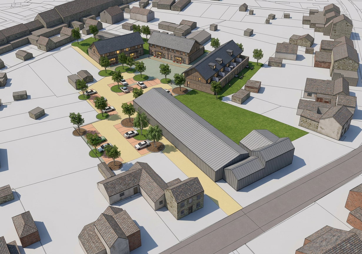 do not change the materials of the building and do not change the design of the building do not change the parking and road do not change the curb design this is a commercial building add hyperrealist grass in the green areas show warm sunlight