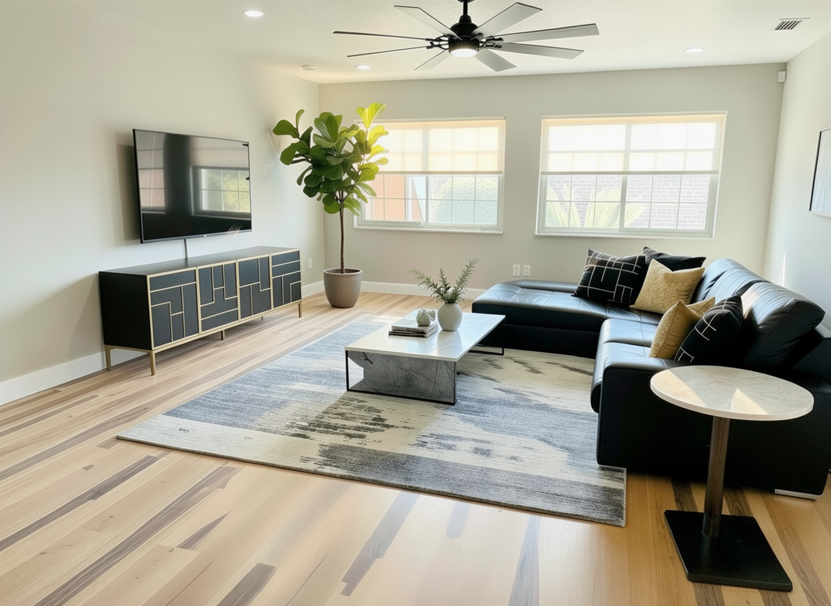 remove the black hutch below the tv replace the small round side table with a black modern side table with a house plant on top