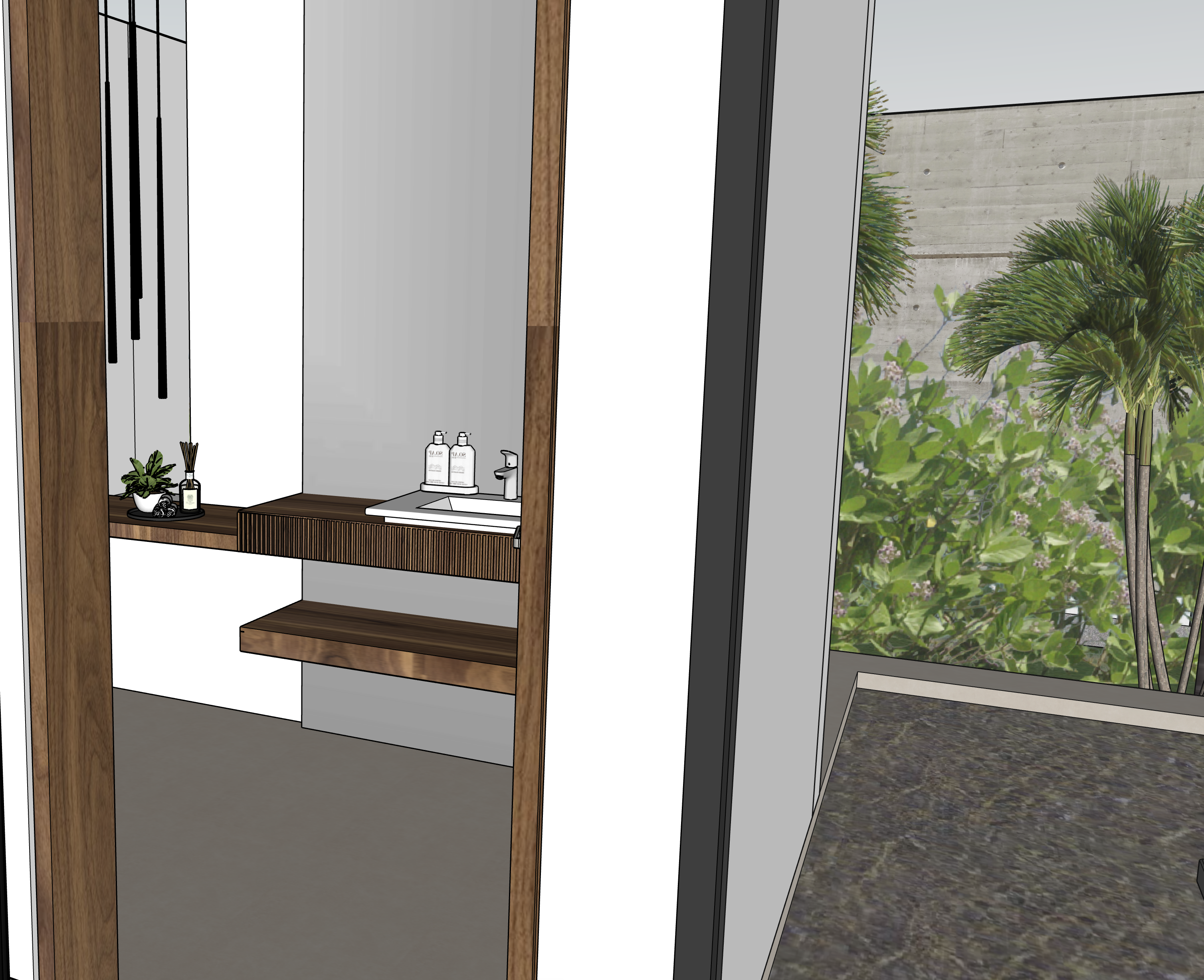 modern vanity view mirror with vertical indirect lighting and narrow window black pendant lighting
