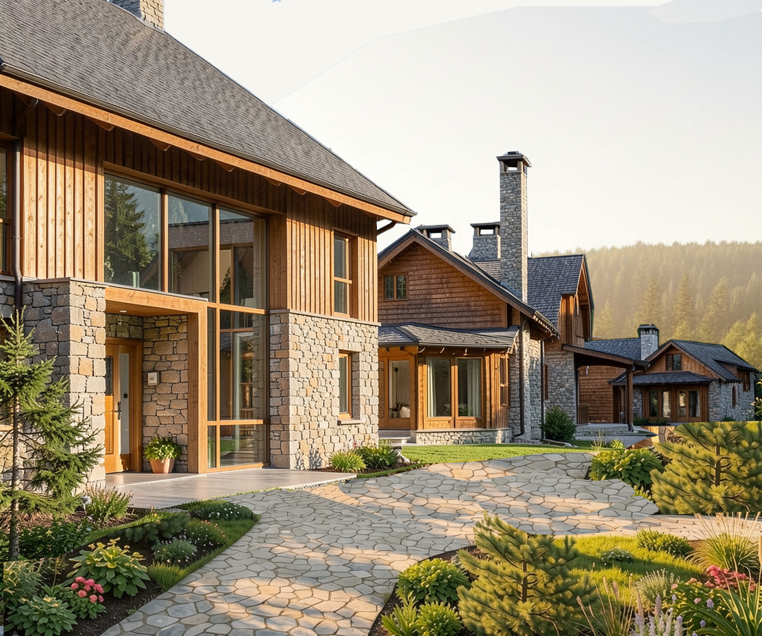 add people walking and lengthen the pathway to the last cabin