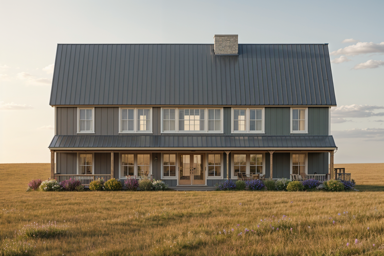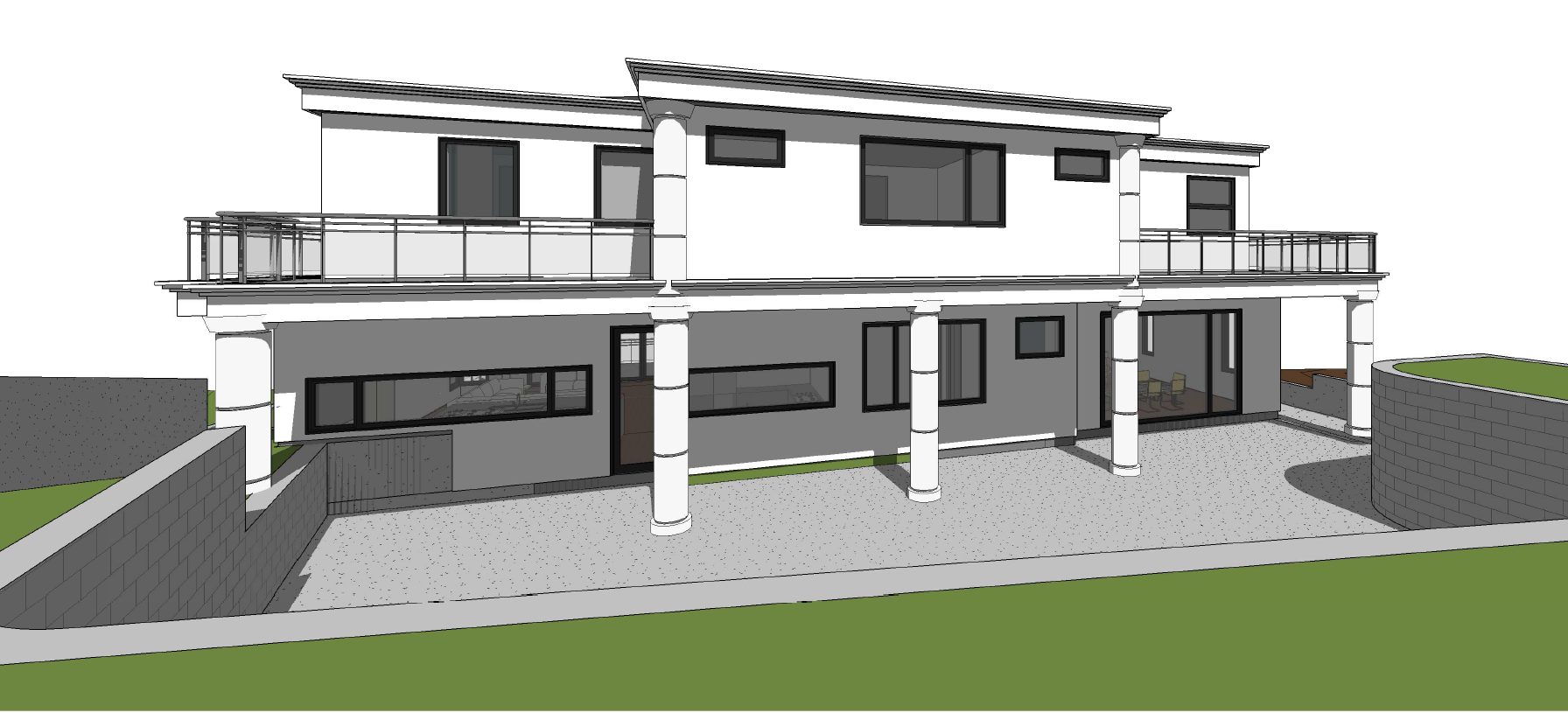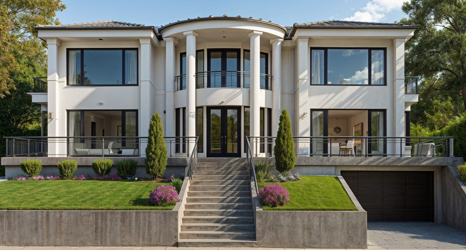 this is the backyard and backface of the house render a transitional neoclassical white three story house with a white fascia and brown slate tile roof use a bright sunny atmosphere to highlight the clean lines of the architecture the windows are large and black framed adding contrast walnut brown garage door front door and soffits trims in crisp white for a sleek look surround the house with lush green grass the ambiance should be warm and welcoming evoking a sense of contemporary elegance and comfortable living located on a hilly seattle street the landscape should be a sophisticated french style with lots of topiary shrubs throughout the proporty bright purple large lavendar flowers and hydrangeas strategically placed for beauty
