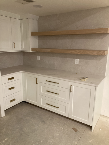 do not change the cabinets in any way preserve the exact cabinet colors materials finishes dimensions door and drawer styles hardware spacing alignment and all geometry exactly as shown do not alter the countertop shape backsplash appliances flooring lighting fixtures or wall structure only remove the construction materials clutter and mess from the scene clean the room and make it look finished and staged add a few simple tasteful home accessories appropriate for the style of the space but do not add or remove any furniture windows or architectural elements maintain the original lighting direction and realism enhance clarity and polish the photo while keeping the cabinetry and room design completely unchanged do not alter the lighting to keep the cabinet colors as they are in the image add flooring stage for a wet bar