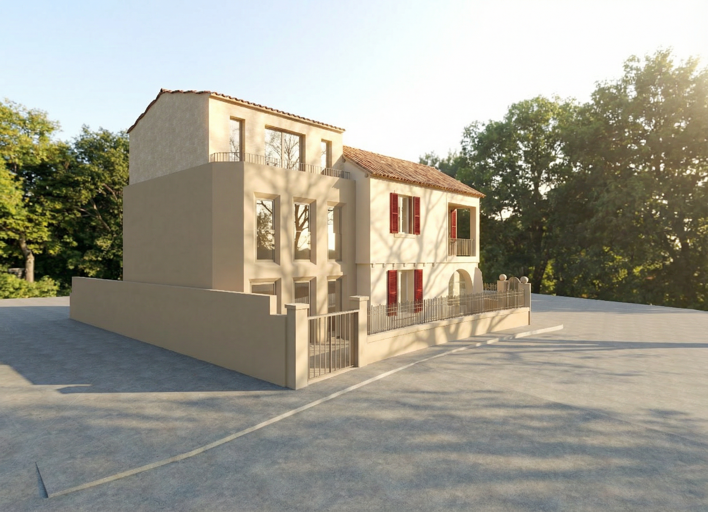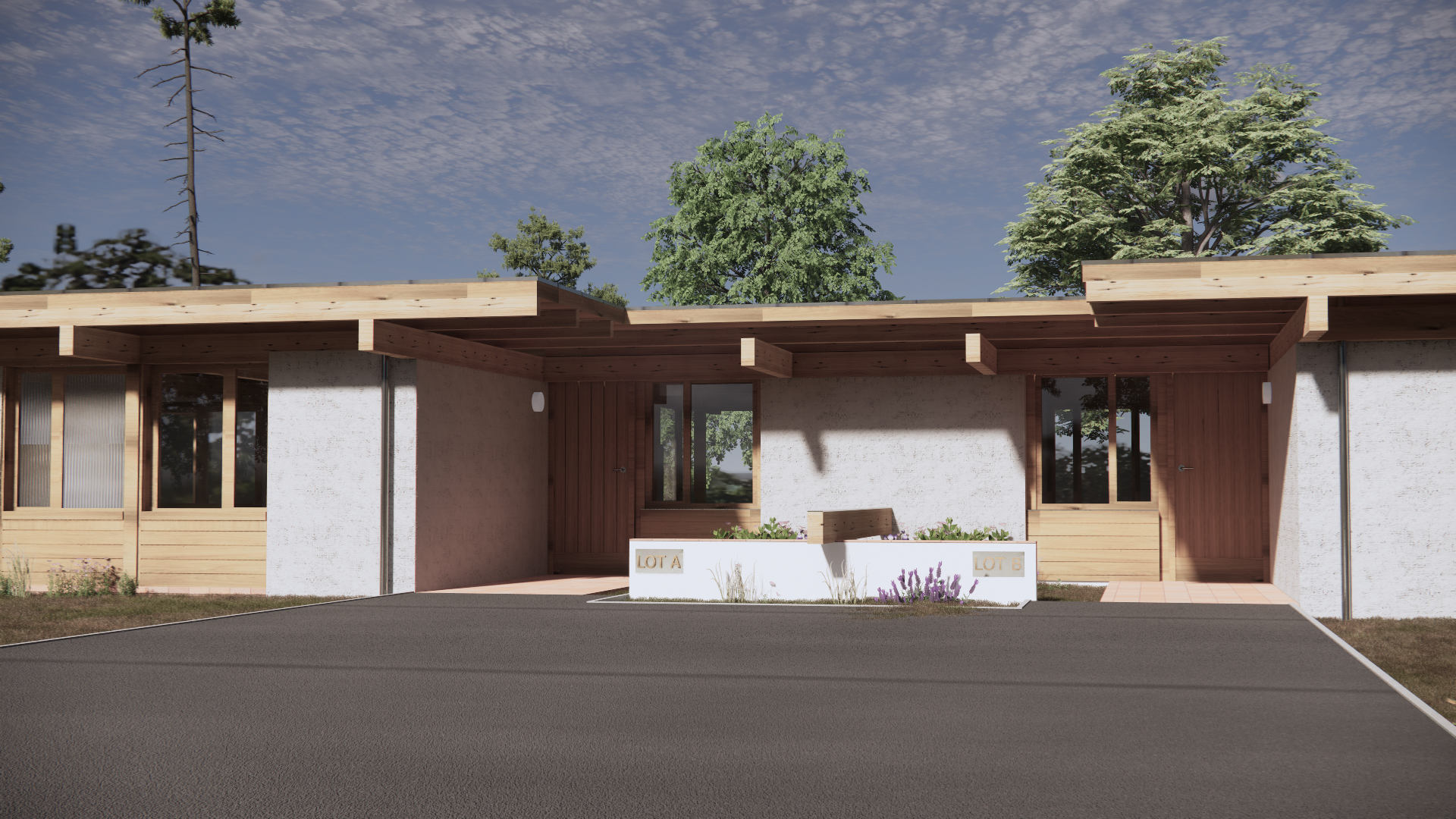 render a photorealistic 3d perspective of this house reference the current material style just enhance them concrete walls pine wood beams pine wood windows red stone floor eep model geometry the same windows doors roof walls make a lush vegetation that looks french oceanside without flowers do not change the view only enhance the current materials and make the landscape nicer vegetation detailed textures in the wood siding the driveway and glass reflections and a vibrant clear sky render in hyper realistic architectural visualization quality 8k resolution