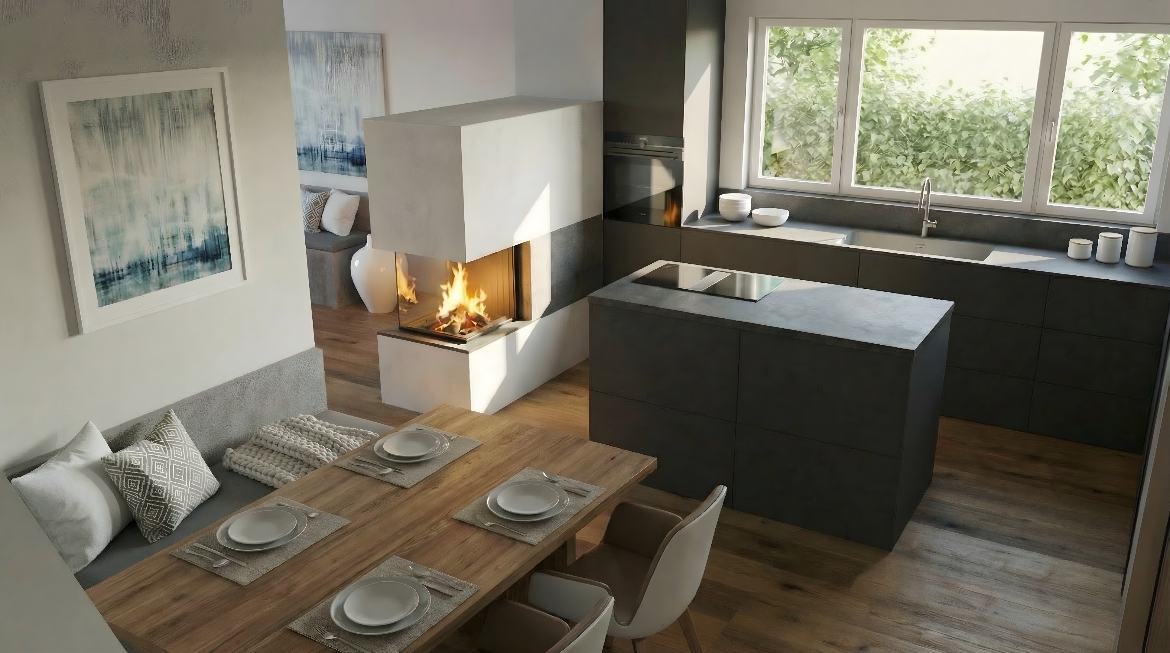 make it in the style of the reference image but the kitchen should stay dark