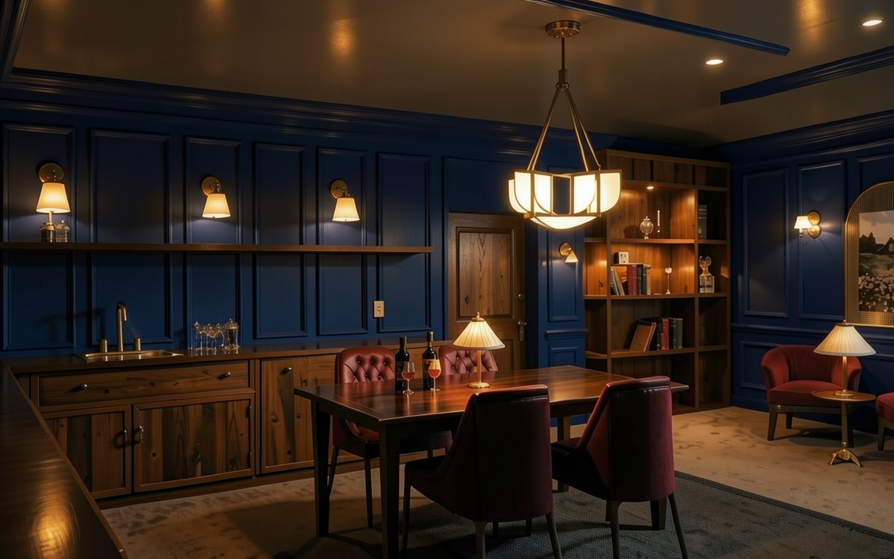 make wall paneling navy blue keep everything else the same make warmer and moodier navy blue vaulted ceiling remove blue strip on top