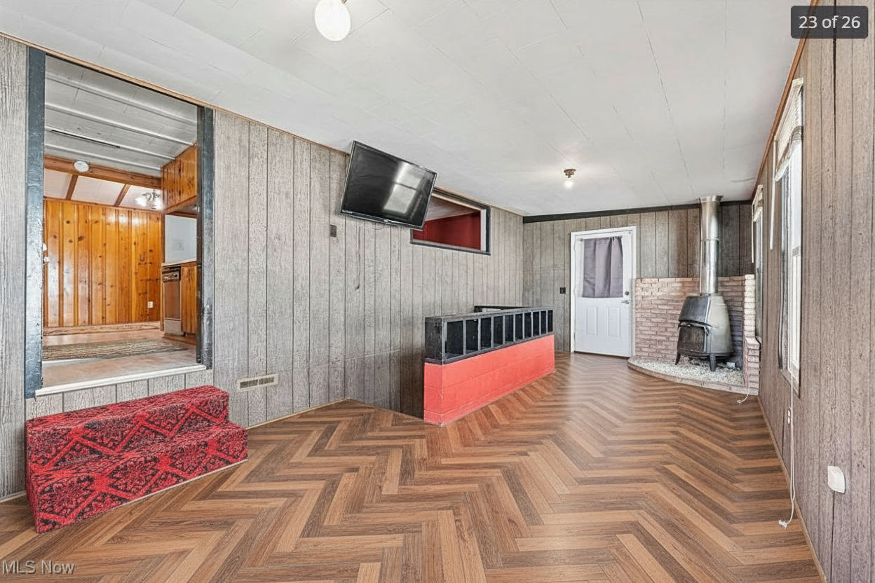 remove the wood burning stove corner paint the wood walls white and remove the tv from the wall