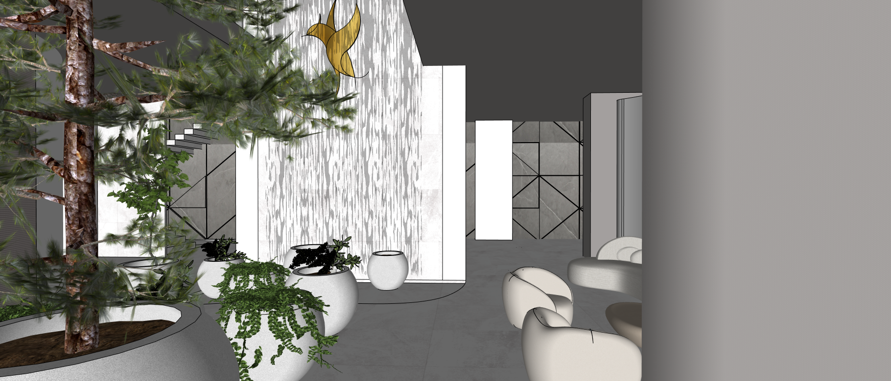 es una clinica con colores claros y acabados de lujo el loco es dodaro y el nombre altea en negro la recepcion en marmol travertino al centro un pino gigante con un fondo un muro lloron mesas de centro en blanco y la imagen con mas calidad