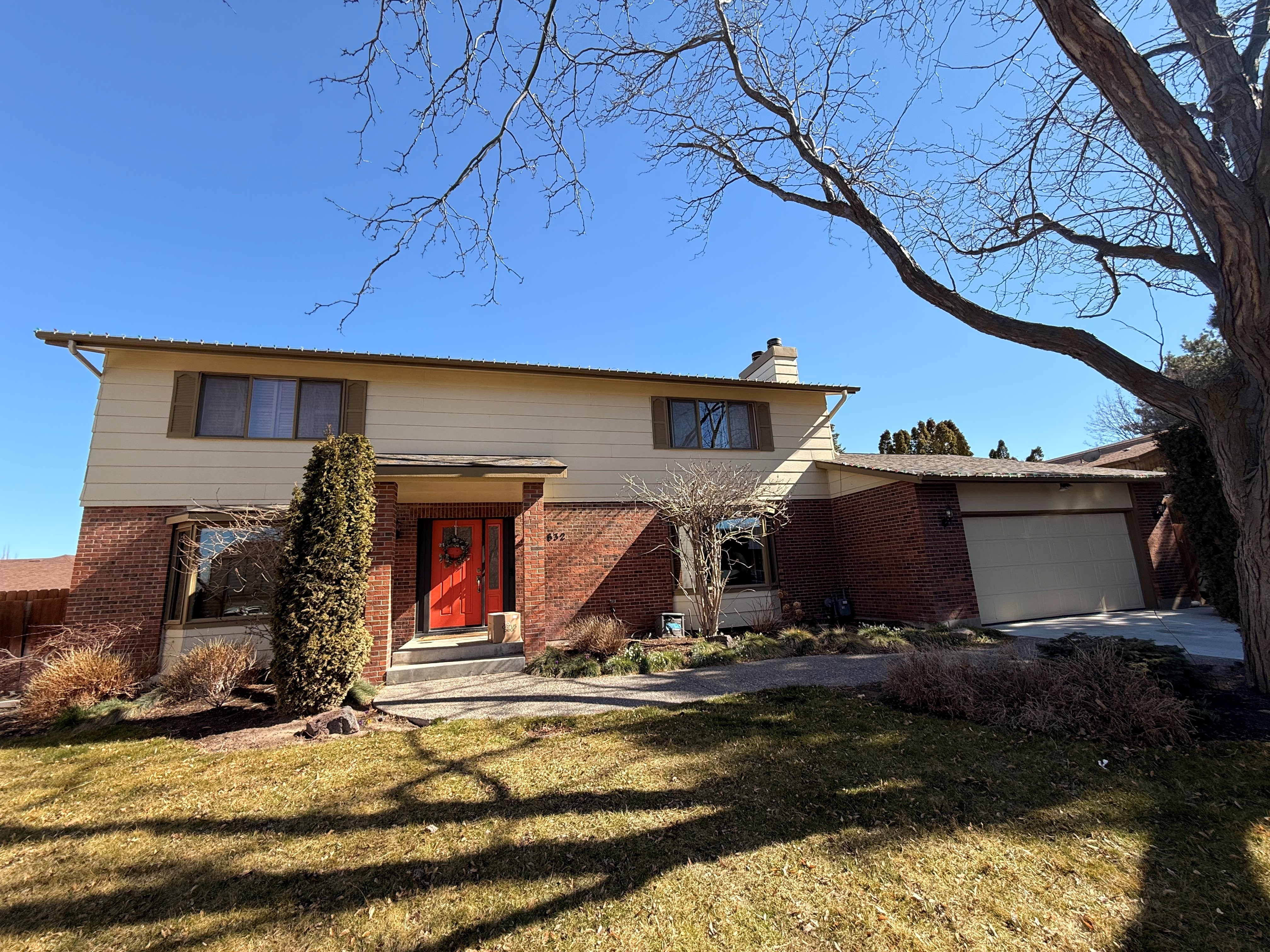 exterior shot a serene two story house with a retro modern style featuring a white brick exterior and white colored vertical board and batten on the second story the welcoming front door is a full length glass adding large windows with wooden shutters complement the overall design the surrounding landscape is a lush mix of deep green shrubs and a manicured lawn basking in warm sunlight the sky above is a clear bright blue enhancing the peaceful and inviting atmosphere bare trees stand gracefully casting gentle shadows on the house and ground covered patio over the front door and east window trimed in wood accents