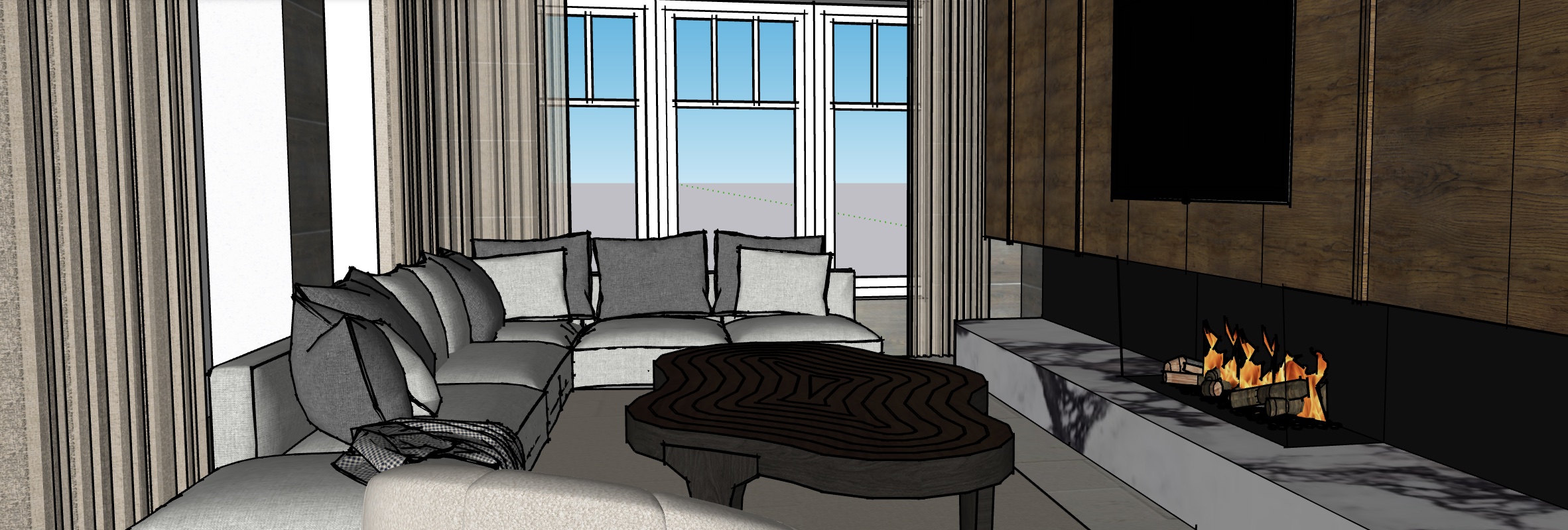 contemporary interior shot living room wood and furniture tv wall in walnut beige neutral colors fireplace mantel neutral colors architecture