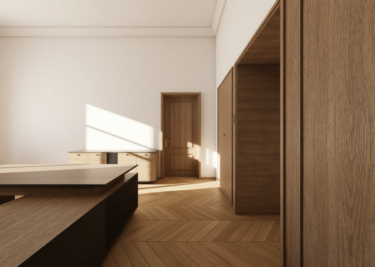 virtually stage the provided interior render of a managerial office reception room in a modern scandinavian minimalist style critical preserve exactly the input geometry layout furniture positions proportions and camera perspective do not move replace resize reinterpret or redesign any furniture or objects do not change the layout in any way important visibility rule only stage and enhance elements that are visible in the current camera view do not add recreate or suggest any objects that are not visible in this view for example lounge chairs or side table if they are outside the frame this is a fixed scene only apply materials colors and styling consistently general style modern scandinavian minimalist clean calm high end uncluttered warm neutral palette warm whites soft greys light natural wood accent color subtle minimal use only if naturally present in visible elements strict rules do not add new furniture do not add extra seating elements do not add it equipment do not add ceiling or floor lamps do not change object positions respect exact perspective and scale visible elements to stage 1 desk foreground keep desk position and form unchanged add minimal styling one desk lamp one small plant one notebook or paper element one pen holder keep the desk clean and uncluttered 2 console main focus of this view use the existing coffee machine do not add another create a complete neat coffee setup cups coffee pods in holder sugar jar or packets honey jar small containers organizing tray everything must appear tidy aligned and functional 3 wall above console add 1 2 large abstract artworks minimal scandinavian style thin frames light wood black or white proper alignment and spacing 4 plants add 1 2 indoor plants one small plant on the console or desk optional secondary plant if space allows planters matte neutral ceramic or concrete 5 floor if visible add a large area rug if the floor area is visible scandinavian style low contrast subtle texture colors light beige soft grey or warm off white lighting soft natural daylight balanced exposure gentle realistic shadows no dramatic lighting no additional light sources beyond desk lamp composition keep the space airy and uncluttered maintain clear circulation paths ensure all added elements are correctly scaled and aligned important do not infer or reconstruct elements that are outside the camera frame do not introduce previously seen furniture if it is not visible here final result a consistent modern scandinavian office reception scene viewed from behind the desk with a clean styled console coffee area minimal desk accessories and balanced decor while strictly preserving the original geometry and only enhancing visible elements
