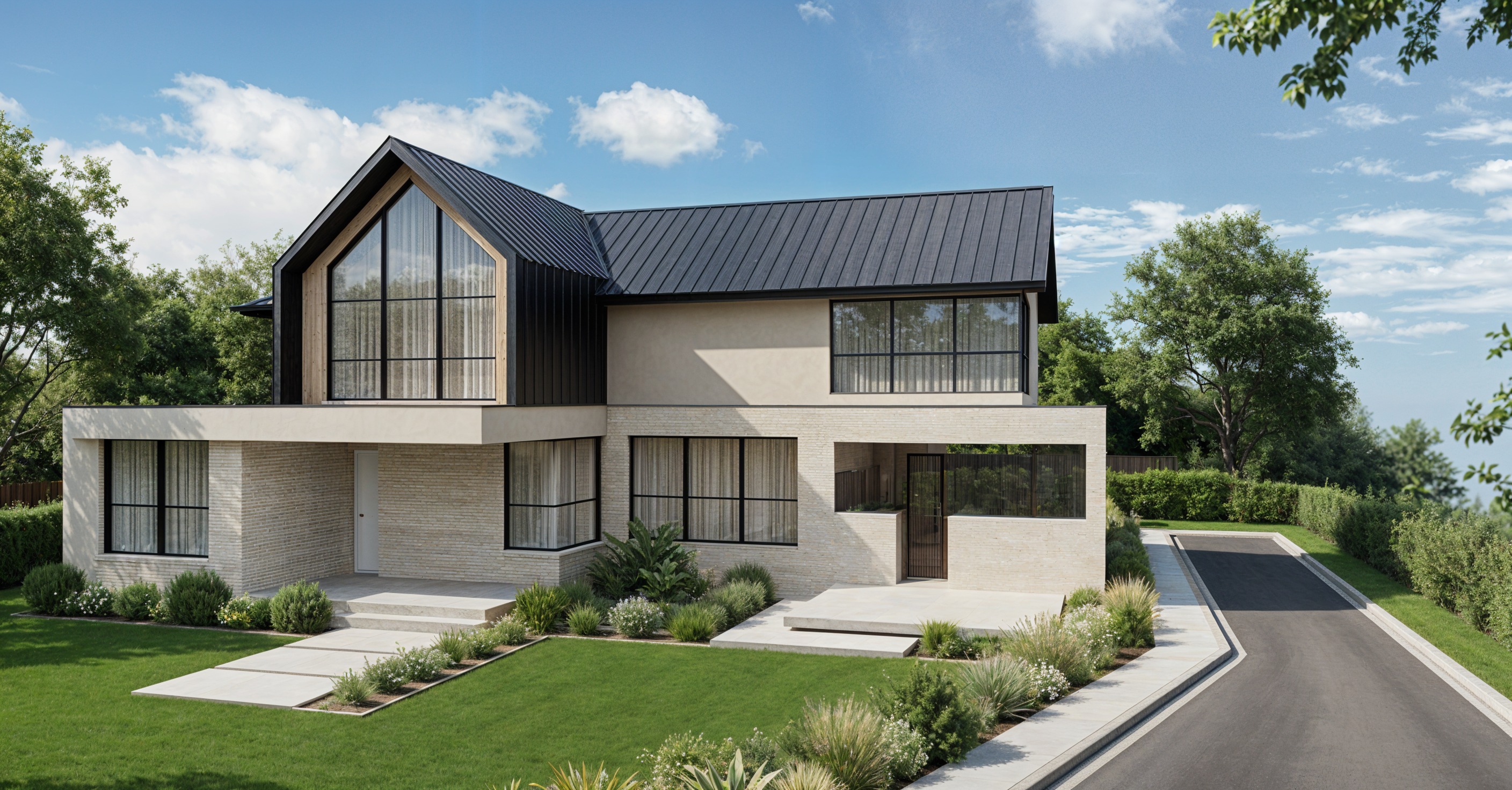 fix thecolorbond architectural roof cladding so that all panels are equal is size make the house sitting more amongst trees so that it is the main focus of the render keep the street footpath road to the right but incorporate it better