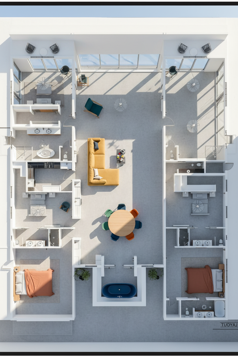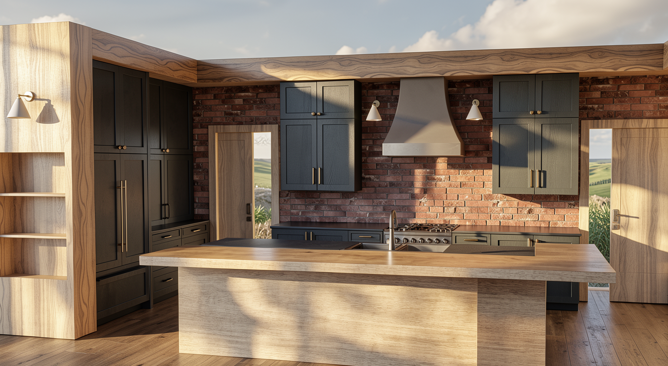 photorealistic interior render of the provided kitchen scene maintain all existing materials layout proportions and design exactly as shown do not redesign or replace any elements preserve the perimeter cabinetry as a black stained wood with visible grain matte to satin finish grain clearly readable through stain the hood vent is brushed aged copper with natural patina variation do not change material or color keep all wood tones textures and finishes consistent with the original image maintain the existing backsplash material and tone exactly as shown preserve cabinet profiles door styles hardware placement and layout keep lighting warm and natural enhancing material realism without altering color balance enhance only realistic lighting and shadows material depth and texture clarity subtle reflections and surface imperfections for realism do not change colors materials or layout add or remove design elements over modernize or stylize style high end residential natural lighting soft shadows ultra realistic materials true to life color accuracy i want to clearly see all perimeter cabinets the pocket doors on the side lead to a hallway keep it in similar color range the wood beam soffit is newly antique looking with knots in it the island is a warm medium caramel stain