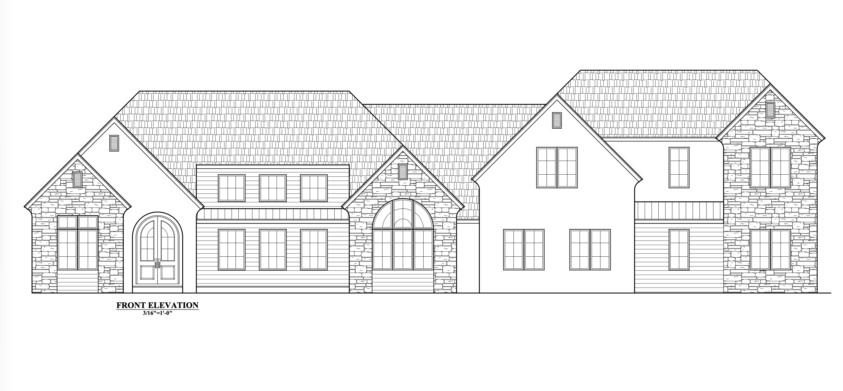 light natural stone veneer white stucco and white board and batten siding complemented by a black architectural shingle roof and black standing seam metal roof accents over smaller roof sections and dormers use daytime natural lighting with a clear blue sky neatly trimmed green lawn low shrubs and a light concrete walkway