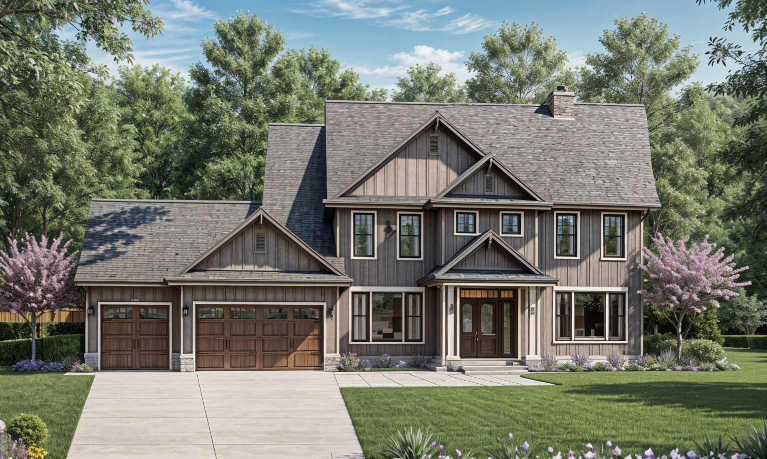 change the vinyl siding color to a darker blue grey make the cedar shakes a grey tan color fix the sidewalk corner in front of the door to be squared off