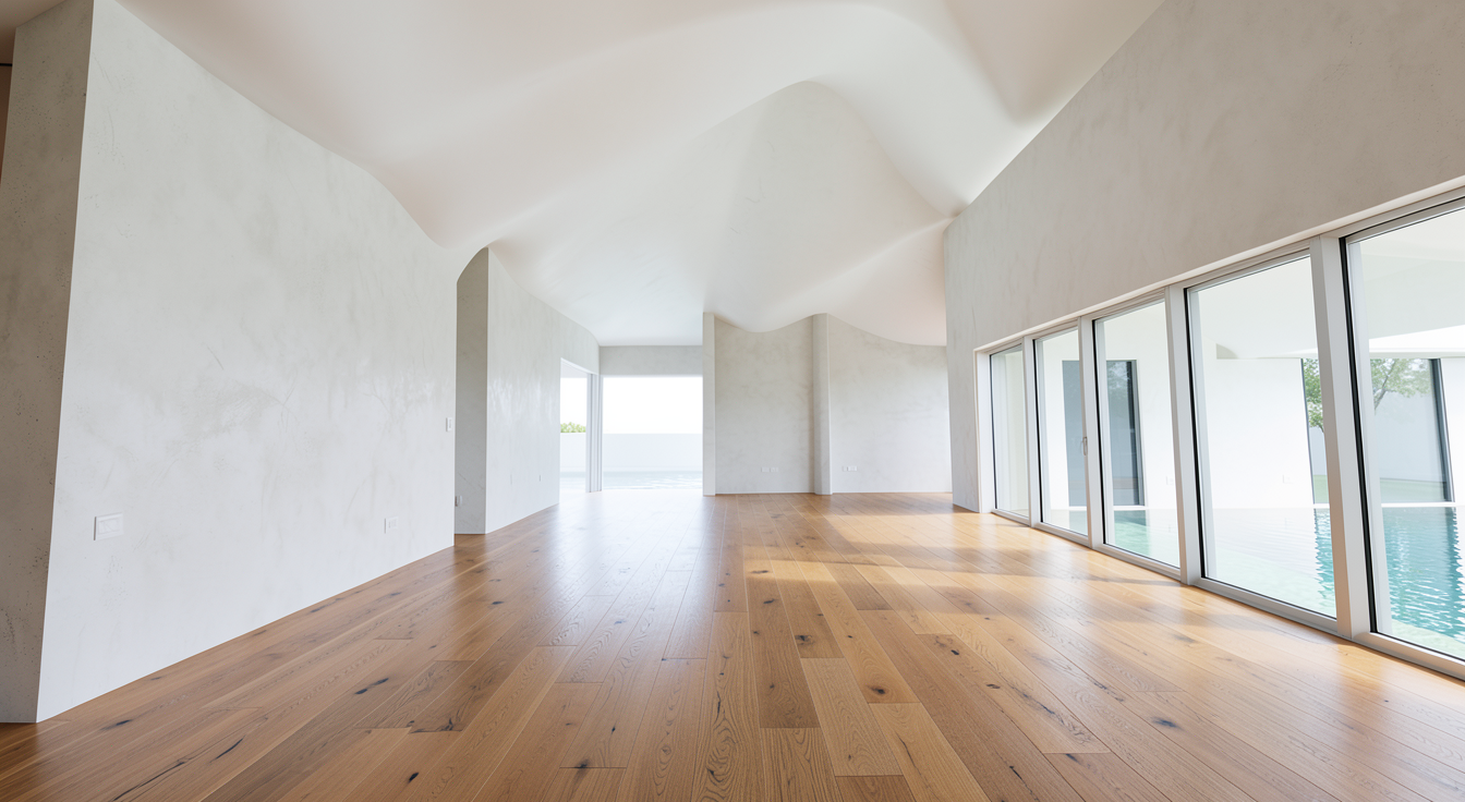 monumental double height main living space with no furniture vast open residential volume bright white sculptural ceiling following the complex architectural form warm wide plank oak hardwood flooring extending continuously across the space calm mineral plaster walls long uninterrupted sightlines across the room large openings bringing soft natural daylight quiet lagoon inspired atmosphere expressed through light reflection and subtle tonal variation ultra wide architectural rendering camera placed low and far back 18mm lens emphasize scale emptiness and spatial clarity