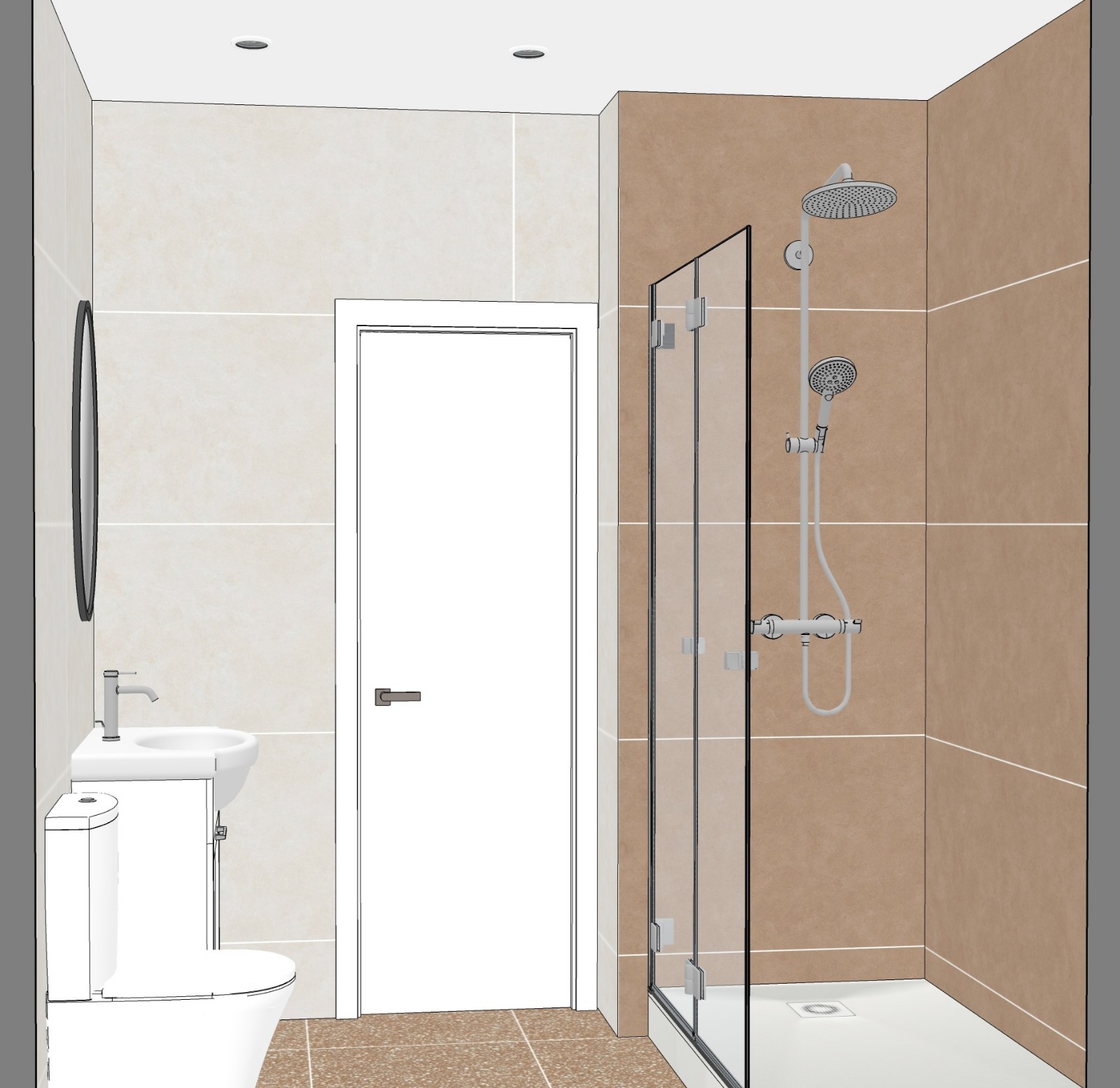 minimalist bathroom interior warm neutral palette walk in shower with transparent glass enclosure and thin metal frame large format beige tiles on walls slightly textured matte finish soft microcement or plaster accent wall in warm sand tone above the shower area clean architectural composition straight lines built in shower system with round rain shower head and handheld shower chrome finish soft natural lighting diffused daylight no harsh shadows calm and cozy atmosphere floor with small scale textured tiles in warm earthy tone wall mounted towel warmer in minimal style chrome realistic materials subtle reflections on glass accurate shadows natural imperfections slightly rough plaster texture camera eye level centered composition 35mm lens ultra photorealistic high detail soft contrast architectural visualization style no people no clutter