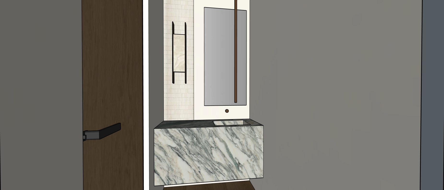 create a highly realistic architectural digest style luxury powder room rendered with v ray corona physically based rendering the space must feel moody atmospheric intimate and cinematic not bright not evenly lit and not showroom like lighting must be low key architectural photography style with controlled contrast soft shadow falloff and natural darkness in corners use realistic camera exposure with slightly underexposed ambient light and emphasize material depth through shadow not brightness materials walls are finished in portola paint brooks in roman clay finish a warm creamy white plaster like surface with subtle tonal variation micro imperfections and soft uneven hand applied texture walls should absorb light softly and never appear flat or overexposed there is one left feature wall section only in ann sacks salluto sticks mosaic bianco natural rectified marble tile the tile should feel tactile and dimensional with soft matte reflection visible grout depth and realistic shadowing in joints it should be the only textured focal wall flooring is grato picos in exquisite wood planks warm natural tone matte finish physically accurate roughness and subtle grain variation the wood should feel grounded and slightly darker due to reduced lighting exposure floating vanity is basstone nyc green oasis marble rich deep green tones with natural veining the stone should feel heavy honed slightly moody and absorb light rather than reflect it strongly mirror is a frameless slab mirror no border no bevel 24 w x 54 h it should reflect a dim realistic environment with slight falloff and no over bright reflections faucet is elemento modern column ceiling mounted faucet in bronze finish brushed and slightly aged with controlled low specular highlights there is a single wall mounted bronze control knob for the ceiling faucet system minimal and functional placed near the vanity it should feel tactile grounded and slightly shadowed lighting includes only one ida wall lamp by st phane parmentier placed on the left tile wall only this is the primary light source emitting warm dim diffused light with low intensity it should create soft directional shadows gradient falloff and partial darkness in corners no other artificial lighting exists lighting rendering instructions critical use v ray physical camera exposure slightly underexposed 0 5 to 1 2 ev look white balance warm interior tungsten 3000k 3200k lighting ratio high contrast not evenly lit shadows soft but present layered and natural no flat ambient fill light no over bright whites or blown highlights emphasize shadow detail and material depth over brightness global illumination should feel realistic but restrained not fully filled in camera composition 35mm lens eye level composition subtle depth of field frame should feel like a high end architectural digest editorial shot with intentional negative space and sculptural balance slight vertical correction natural imperfections and cinematic framing avoid bright showroom lighting overexposed whites flat evenly lit space plastic or overly smooth materials cgi clean render look excessive reflections or gloss multiple light sources