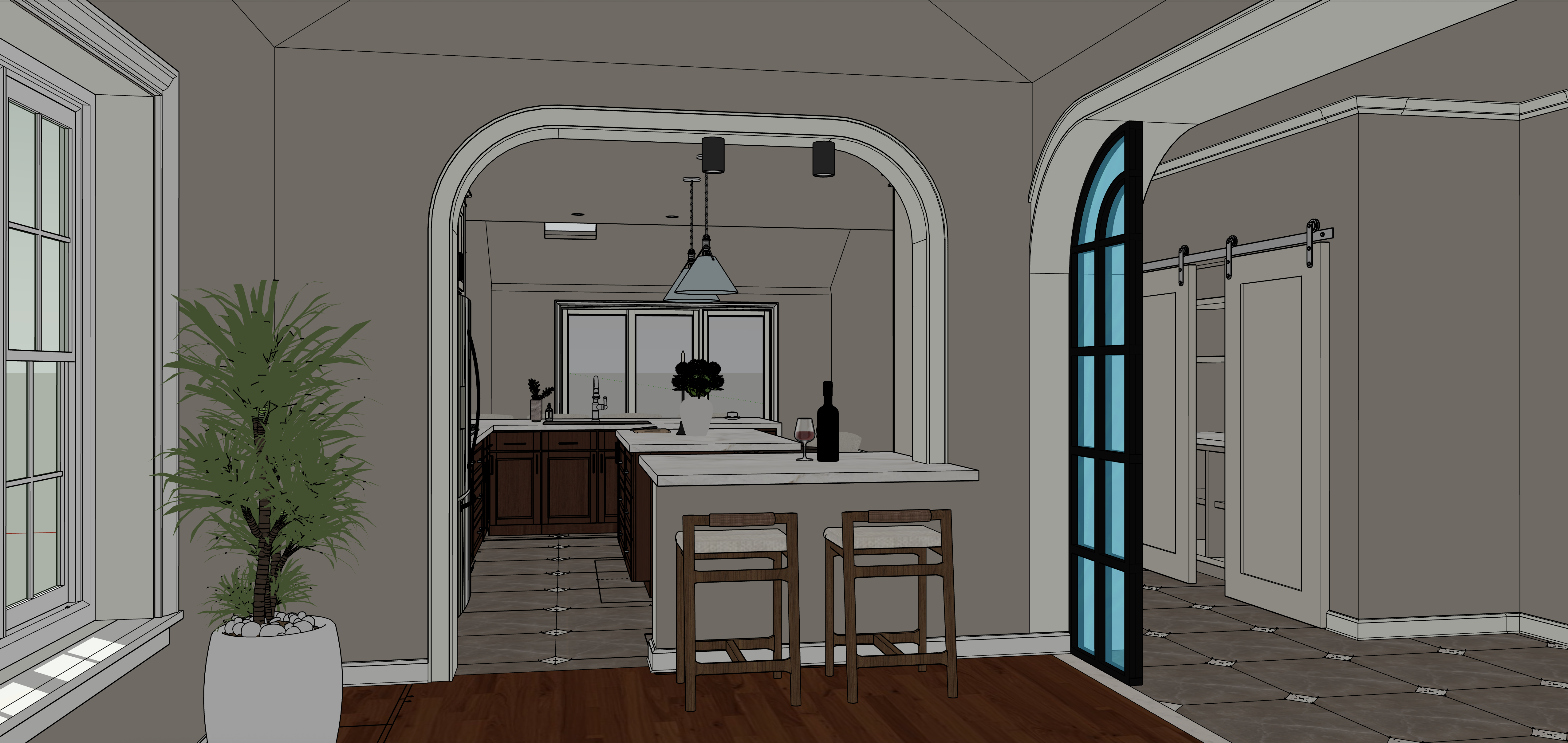 strictly preserve the exact layout geometry and proportions of all elements do not add remove infer or complete any architectural elements cabinetry millwork or furnishings only render what is explicitly modeled if areas are undefined or simplified leave them minimal and unchanged this is a schematic sketchup model do not enhance redesign or fill in missing details any deviation from the provided geometry is incorrect all materials colors and finishes shown in the model are final and must not be altered or replaced base cabinets must remain cherry wood do not change to white or any other finish do not apply default materials use soft natural daylight coming through the windows supplemented by subtle artificial lighting under cabinets and above materials should appear tactile and realistic cherry wood grain cream painted cabinets quartz countertops taupe eggshell walls baby blue pendants with chrome hardware polished nickel cabinet hardware and plumbing fixtures and fabric textures include realistic reflections and shadows space should feel warm calm minimal and uncluttered camera angle at human eye level composed like professional interior photography high quality architectural visualization remove blue hue on glass replace with clear do not add additional cabinets at rear