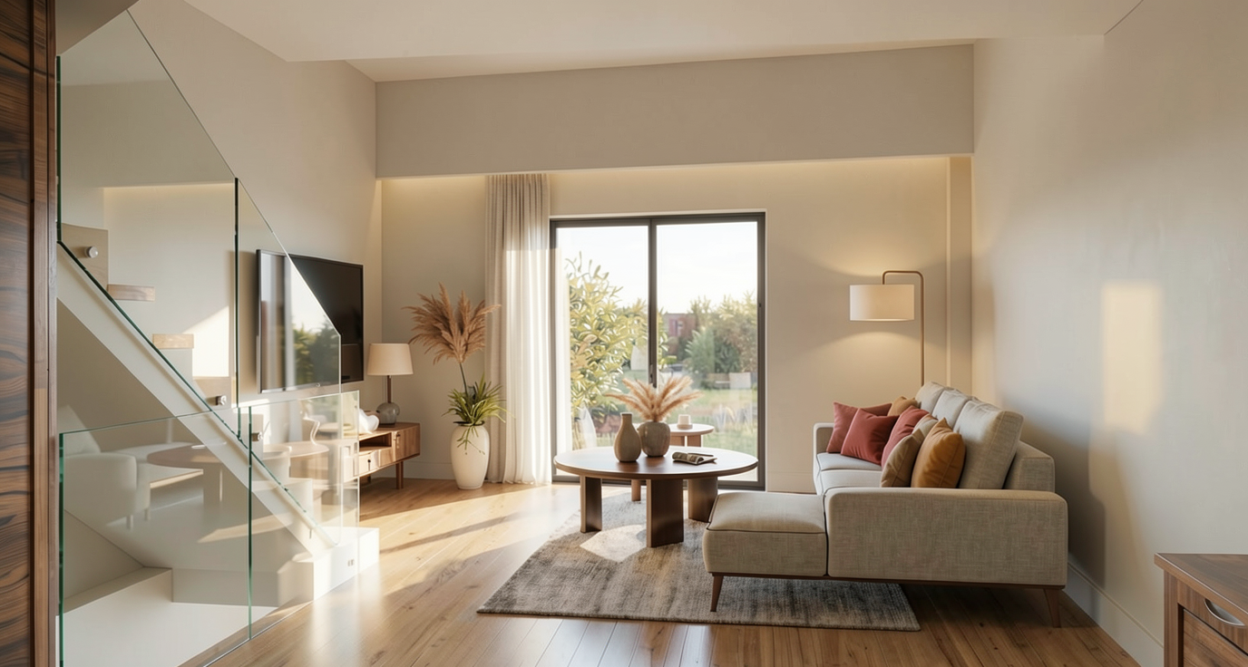 create a high end photorealistic render of a bright luxurious bedroom with a refined and expensive feel the materials should feel authentic with realistic texture the flooring is matte with a polished cement look in a sand off white shade cohesive and elegant the lighting should be warm natural and balanced add beautifully arranged high quality bed linens with soft folds and a soft aesthetic the overall mood should feel contemporary sophisticated and editorial as if photographed for a luxury interior design magazine keep the initial materials like cotton linen rattan light oak wood n the right curved s shaped pendant light made of translucent stone onyx like material with natural veining in warm beige tones cylindrical ends continuous organic wave form in the center suspended with thin black cables and brass metal brackets preserve exact shape proportions and placement enhance only material realism translucency and stone texture the headbed is cotton linen fabric on the center off white color and only on the right there is rattan
