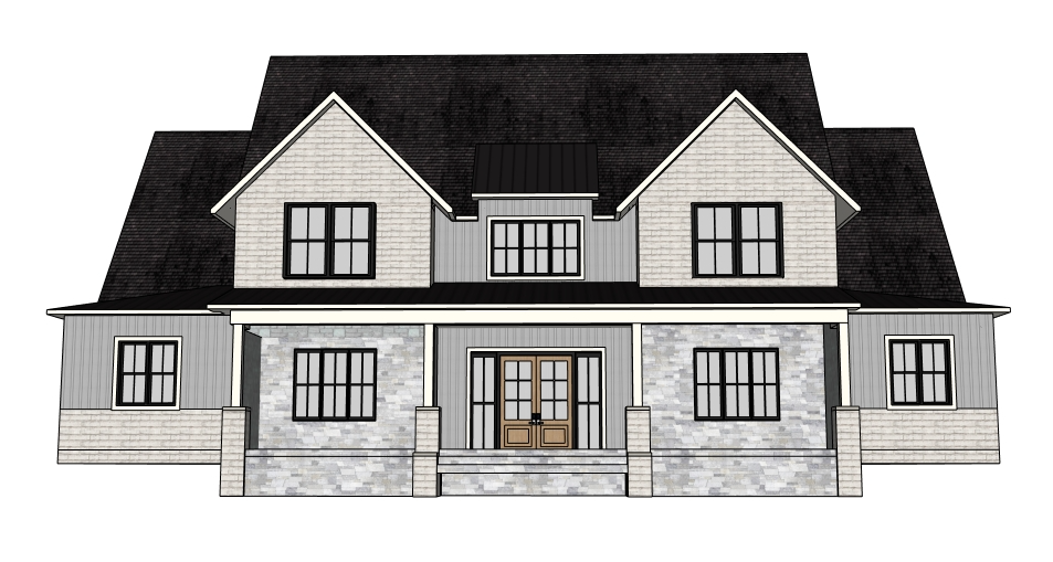 house sits on a small hill lot in a subdivisions white brick under windows on left and right side brick above porch on left and right side siding in the middle and white stone on facade white stone on foundation and left and right under the porch sherwin williams drift of mist colored siding in the middle black metal roof on porches and shingles everywhere else black windows stained front door with black sidelights surrounded by native plants concrete driveway on right side