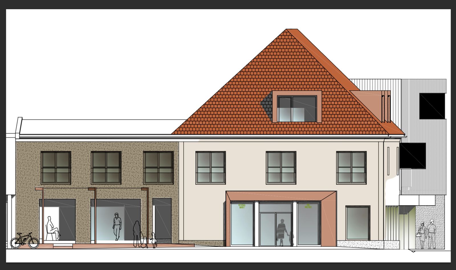 the building is located in the small city feldbach in styria the right entry is for a grocery store on the left side darker walls is a restaurant stick to the colors in the picture right entrance portal is corten metall