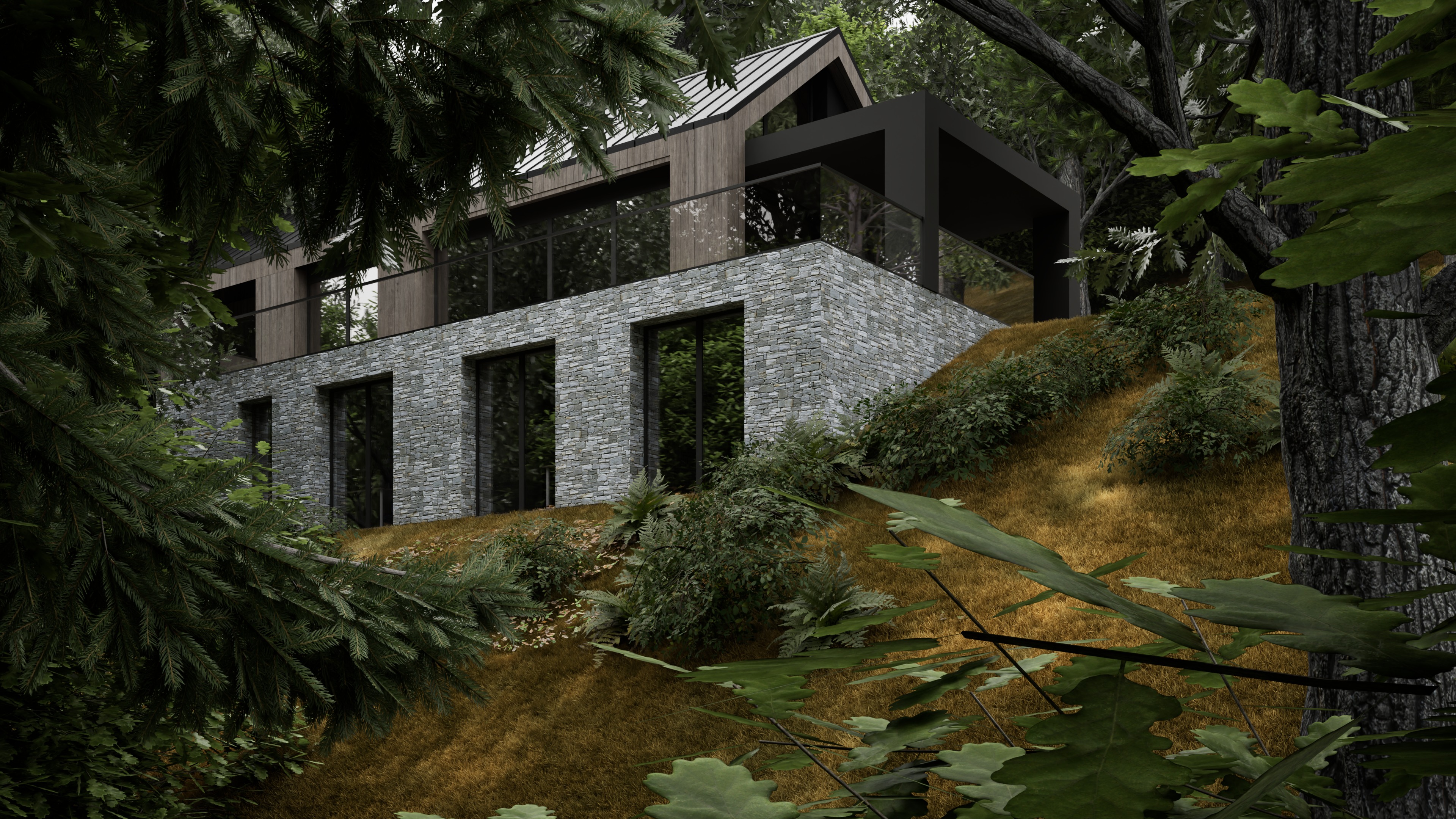 a modern architectural house nestled on a hillside featuring a sleek gable roof design with wooden panels in deep charcoal gray contrasted by large windows that reflect the lush surrounding greenery the lower level is elegantly constructed with textured light gray stone bricks harmonizing with the natural landscape surrounding the house there are tall dark green trees and foliage creating a serene and peaceful atmosphere the hillside is covered in soft sunlit golden brown grass dotted with various ferns and shrubs in rich leafy greens the overall scene is bathed in soft natural light enhancing the tranquil harmonious blend of architecture and nature makte ultrarealistic render with little bit more dull lights and a little fog make the wood color grey brown little bit older planks the windows should be less see through and the stone should be litttle darker