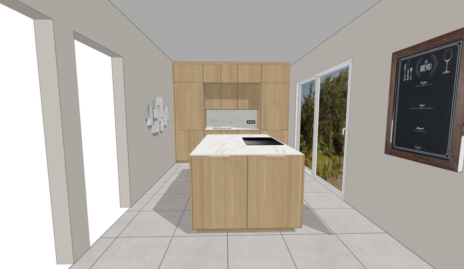 sur la droite de la cuisine il y 15 cm d espace pour laisser passer un rideau pour la porte fenetre