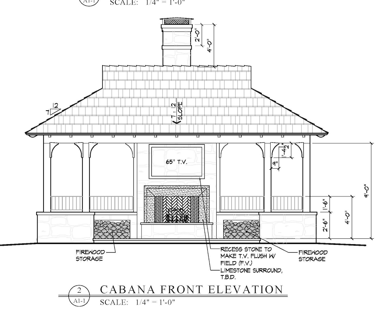 photorealistic architectural rendering based directly on the uploaded line drawing preserve the exact proportions roof pitch massing openings columns and chimney exactly as shown architectural style refined atlanta traditional in the style of classic buckhead residential architecture timeless restrained and elegant add a rectangular swimming pool in the foreground centered and aligned symmetrically with the cabana pool design should be understated and classic light plaster interior simple stone coping calm reflective water no resort styling cabana materials natural limestone or painted masonry base stained wood columns and trim traditional cedar shingle roof with subtle texture masonry chimney with classical proportions site context mature atlanta residential backyard manicured lawn clipped hedges minimal landscaping no modern elements lighting soft late afternoon natural light gentle shadows warm but neutral color balance architectural photography style camera eye level straight on or slight angle composed and symmetrical similar to high end residential portfolio photography mood quiet luxury permanence proportion driven design do not modernize or reinterpret the architecture do not add decorative excess do not change the building design only add the pool and site context