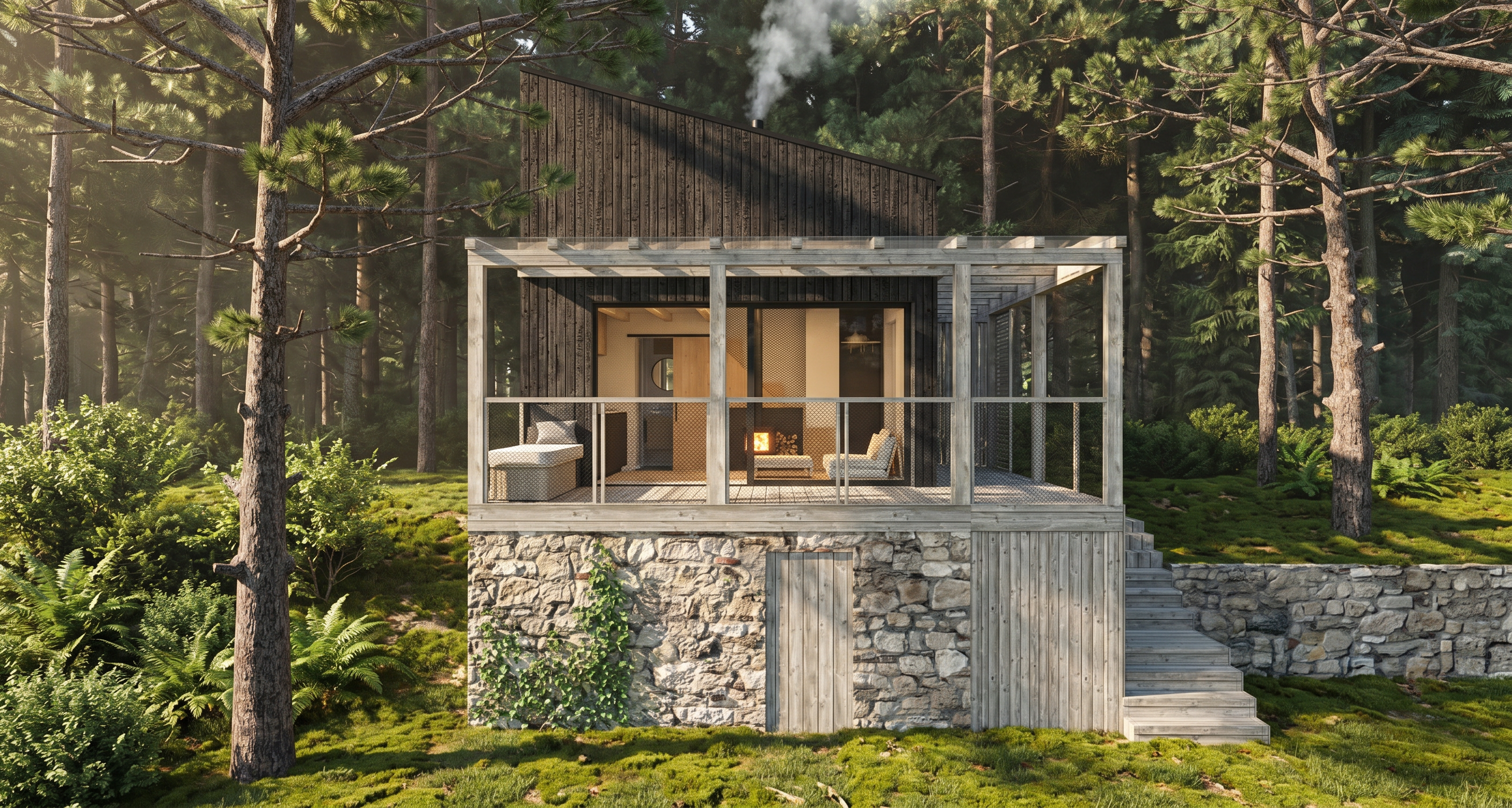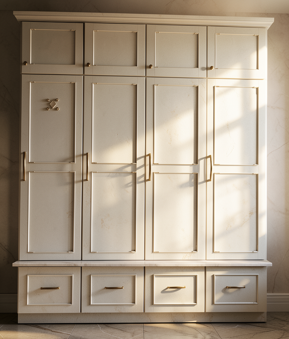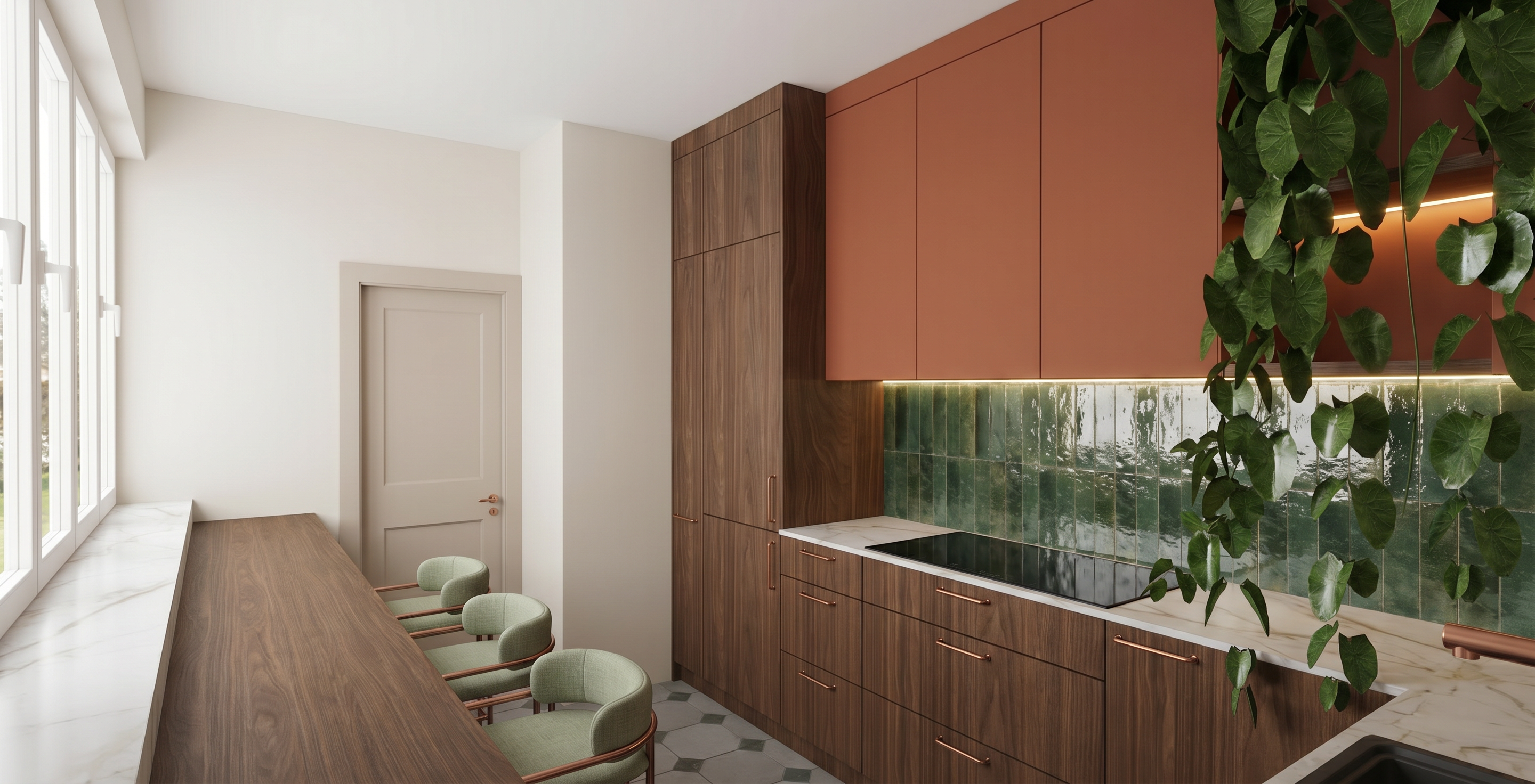 in the main kitchen only add led strips inside the upper central white cabinets a soft ambient light not harsh or overly bright do not add led strips to the cabinets in the back kitchen area also add lighting underneath the two shelves in the main kitchen again a soft ambient light not harsh or overly bright turn on the two ceiling spotlights in the main kitchen a soft ambient light not harsh do not turn on the lights located within the bar cabinetry ensure no light shines onto the central bar cabinets do not change any materials throughout the entire render leave the colors exactly as they are allow a small amount of light to be visible in the back area the secondary kitchen a soft ambient light not harsh