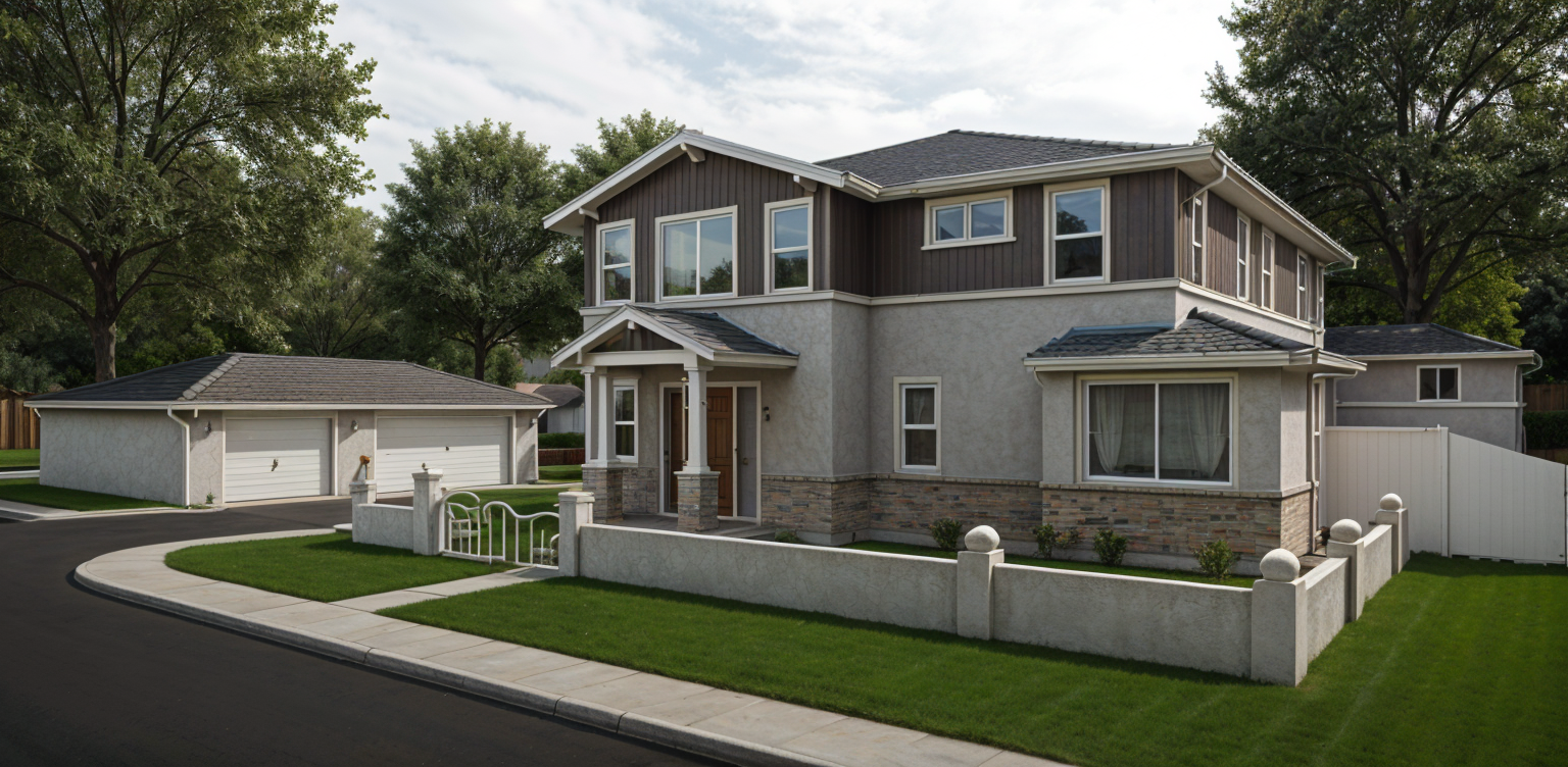 futurism detail shot create a serene and modern architectural rendering of a single story house the house features a light gray exterior with a smooth finish use charcoal gray for the roof adding subtle texture incorporate large glass windows with dark frames reflecting the soft glow of the setting sun the surrounding landscape includes lush green grass and small neatly trimmed shrubs with a bright green hue at the base of the house the driveway is a textured medium gray stone the overall atmosphere should be calm and inviting set during a golden hour with warm natural lighting that casts gentle shadows include a clear sky with hints of orange and pink tones emphasizing a peaceful evening ambiance architecture