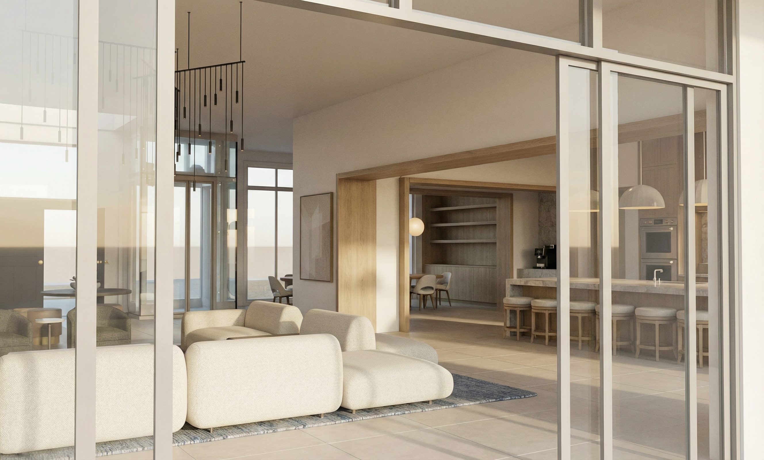 realistic lighting and ambiance hyperrealist photo light beige matte 48 square floor tile all woods are a light neutral oak white quartz countertops