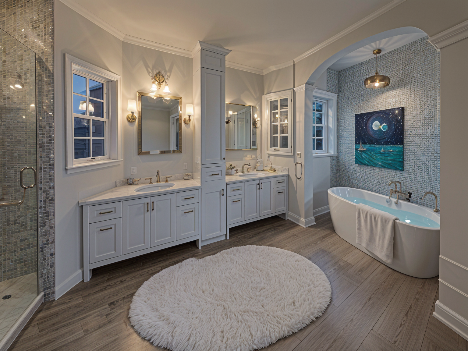 realistic image luxurious bathroom white paneled cabinetry matching mirrors and sconce lights at each vanity small glass pendant light over tub fill tub with water and drape a towel on the edge small glass mosaic tile on back wall behind tub to ceiling glass shower wall on left with small glass mosaic tile on walls fluffy white oval rug in middle of floor change shower mosaic tile to lighter white blue and glass use same tile behind tub on wall make rug fluffier soften the daylight outside add pendant fixture over tub add mirror to face of upper cabinet door make vanities more furniture like make tile less blue colored make outdoor lighting dusk remove bizarre painting over tub make shower mosaic tile lighter color match the sconces and upper lights over the mirrors
