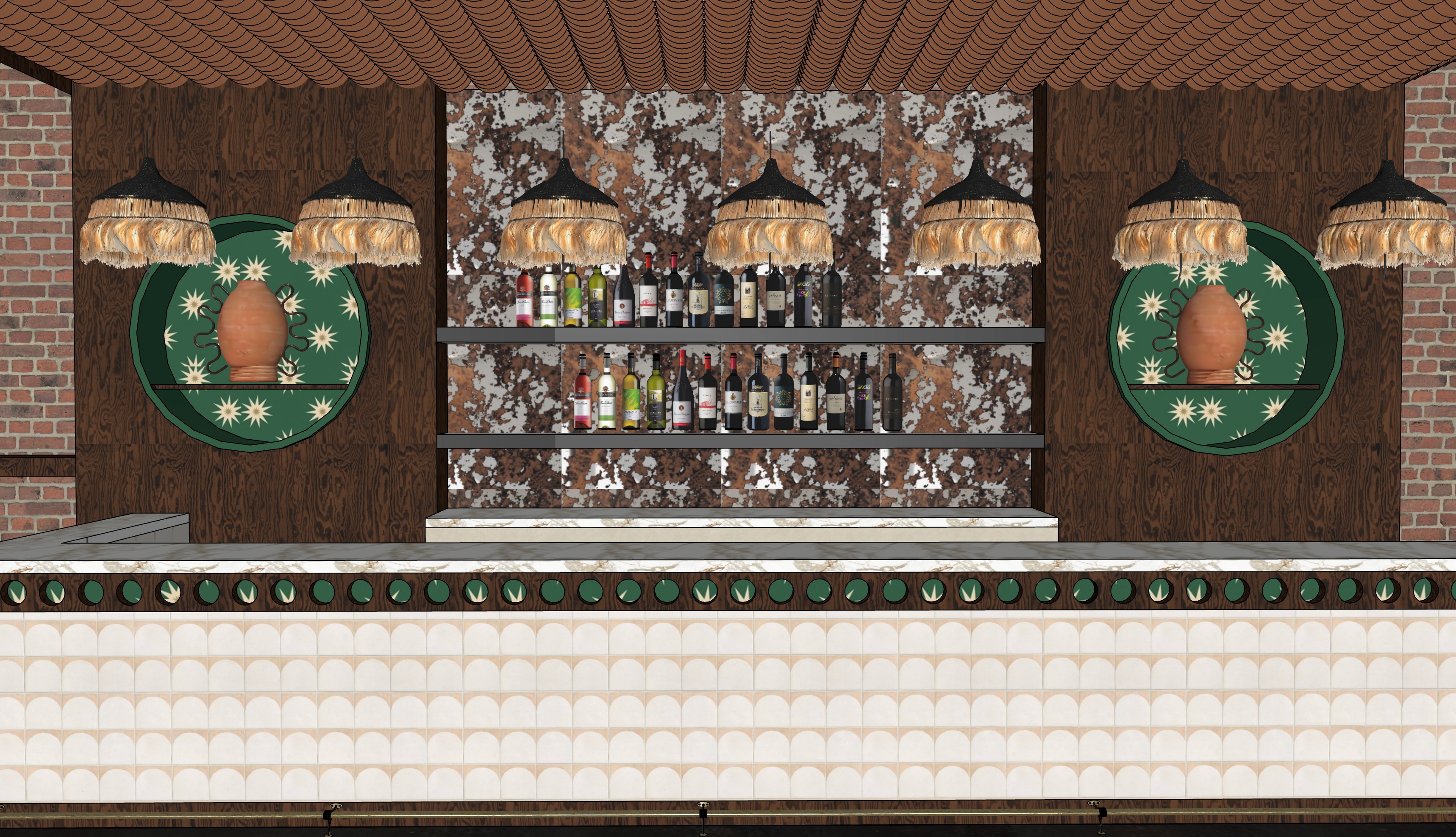 professional architectural photography of a spanish tapas bar interior straight on eye level composition symmetrical framing of bar and back bar warm intimate hospitality atmosphere dark stained oak bar millwork with rich natural grain subtle sheen and realistic wood texture variation honed travertine stone bar countertop with soft edge wear natural pores and tonal variation handmade ceramic tile bar front with slight irregularities uneven glaze reflection and authentic handcrafted character pottery in circle shelves perfectly lit up bar shelves are glass and light illuminates the bottles back bar featuring natural stone slab backsplash with layered mineral texture and depth wood floating shelves holding assorted wine bottles with realistic glass reflections liquid variation and subtle label imperfections decorative green glazed ceramic wall niches with handmade terracotta vessels camel leather barstools with authentic leather texture natural creases soft sheen stitching detail and slight variation between each stool solid wood stool legs with realistic grain and subtle wear terracotta barrel tile ceiling soffit with matte ceramic texture and natural variation handwoven fringe pendant lights with visible fiber texture and warm glowing bulbs emitting soft amber light warm cinematic restaurant lighting practical lighting motivated by pendants soft shadows realistic light falloff subtle bounce lighting from stone and wood surfaces shot on full frame camera 50mm lens shallow depth of field professional interior photography natural exposure hdr global illumination ray traced reflections ambient occlusion physically accurate materials ultra photorealistic hospitality photography architectural digest style dezeen style professional restaurant interior shoot 8k resolution extremely realistic materials subtle imperfections micro scratches dust fingerprints natural variation warm evening service atmosphere inviting intimate elegant rich spanish hospitality environment soft lighitng lights up the front of the bar small can lights are on the ceiling tile better lighting up the bar the front of the bar is equally lit up there are no barstools the tops of the pendant lights are a woven black