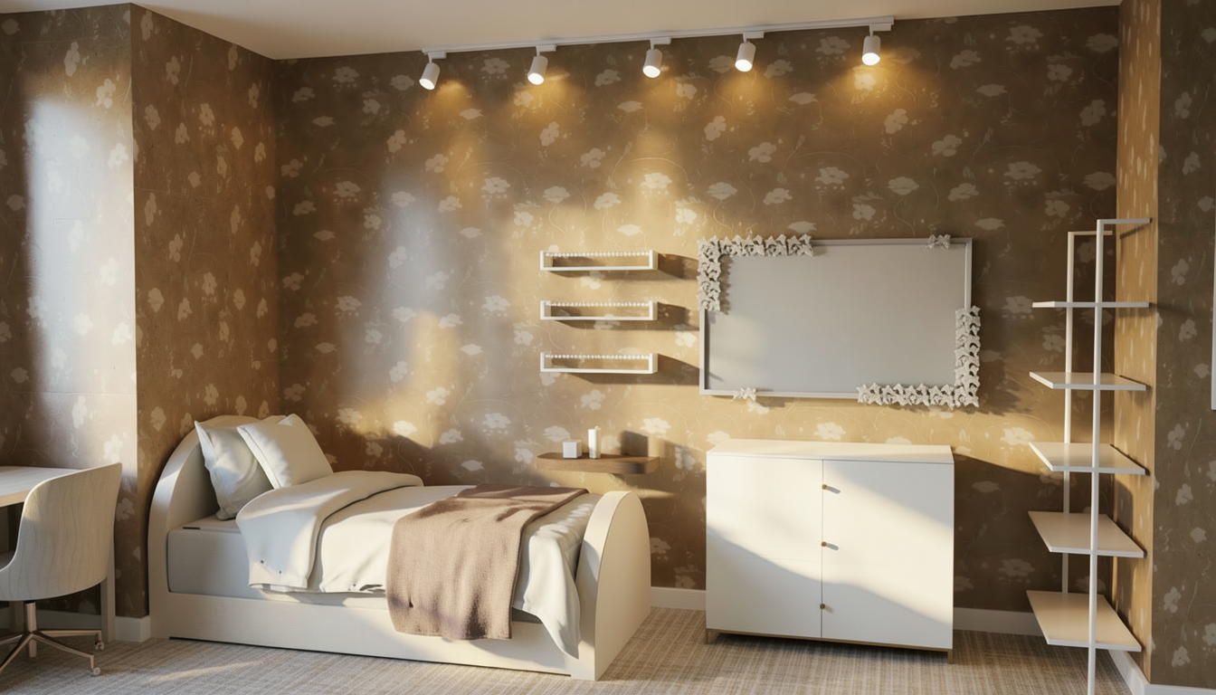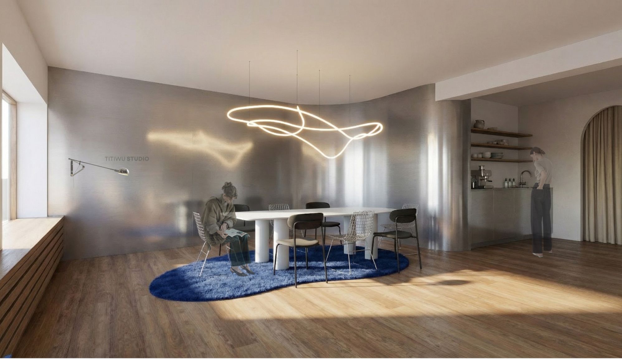 hauptmaterial ist edelstahl metall danach ein senfgelber ton danach ein hellblauer tisch und ein dunkelblauer teppich