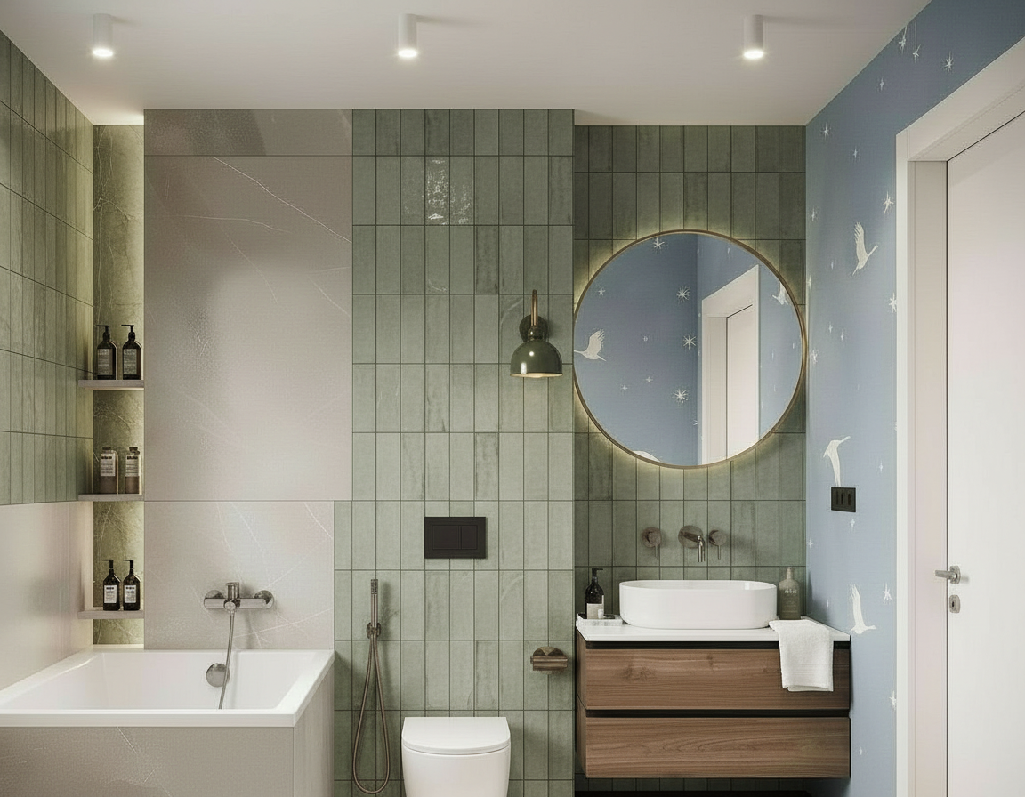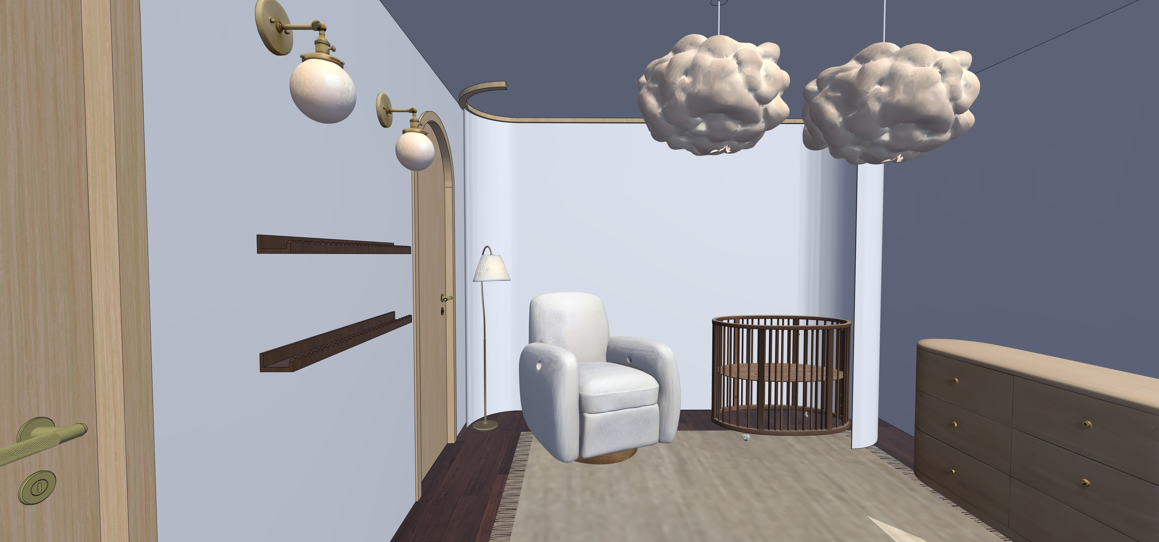 transform the provided image into a real professional interior architectural photograph with dslr quality and true photographic realism preserve exactly the original architecture layout proportions materials cabinetry furniture placement and camera framing scene contemporary baby nursery with a curved architectural niche behind a round wooden crib walls finished with lime wash in light brown and beige tones showing natural mineral texture and tonal variation ceiling finished in the same lime wash tone but slightly darker dark wood flooring large beige rug round wooden crib with vertical slats white boucle nursing chair long dark wood dresser with brass knobs two wooden shelves on the left wall with small baby decorations soft plush toys and a small baby book brass wall sconces with clear glass globes floor lamp next to the chair two cloud shaped pendant lights above the crib behind the crib there is a real fabric curtain with natural folds and soft draping avoiding rigid or artificial appearance camera position height angle and perspective must remain identical apply physically accurate lighting exactly as in the reference image avoid cgi render 3d illustration cartoon fake materials plastic textures wrong wood grain direction oversharpening oversaturation fisheye distortion warped perspective