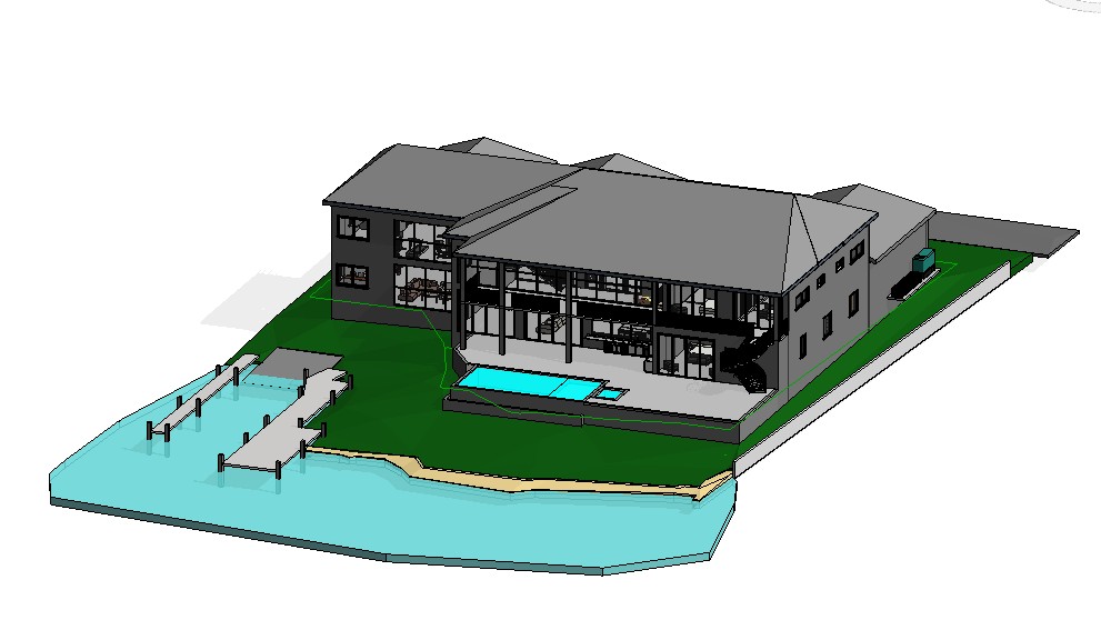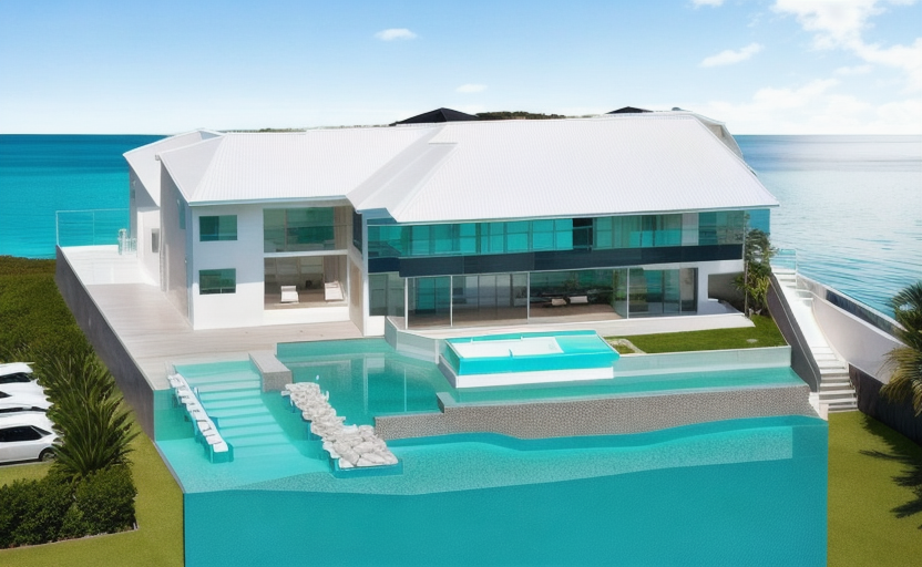 bay front home in florida keys background is tall palms and hardwood trees foreground is bay pool is infinity with light tile finish walls of the home are light gray with coral stone finish on lower level