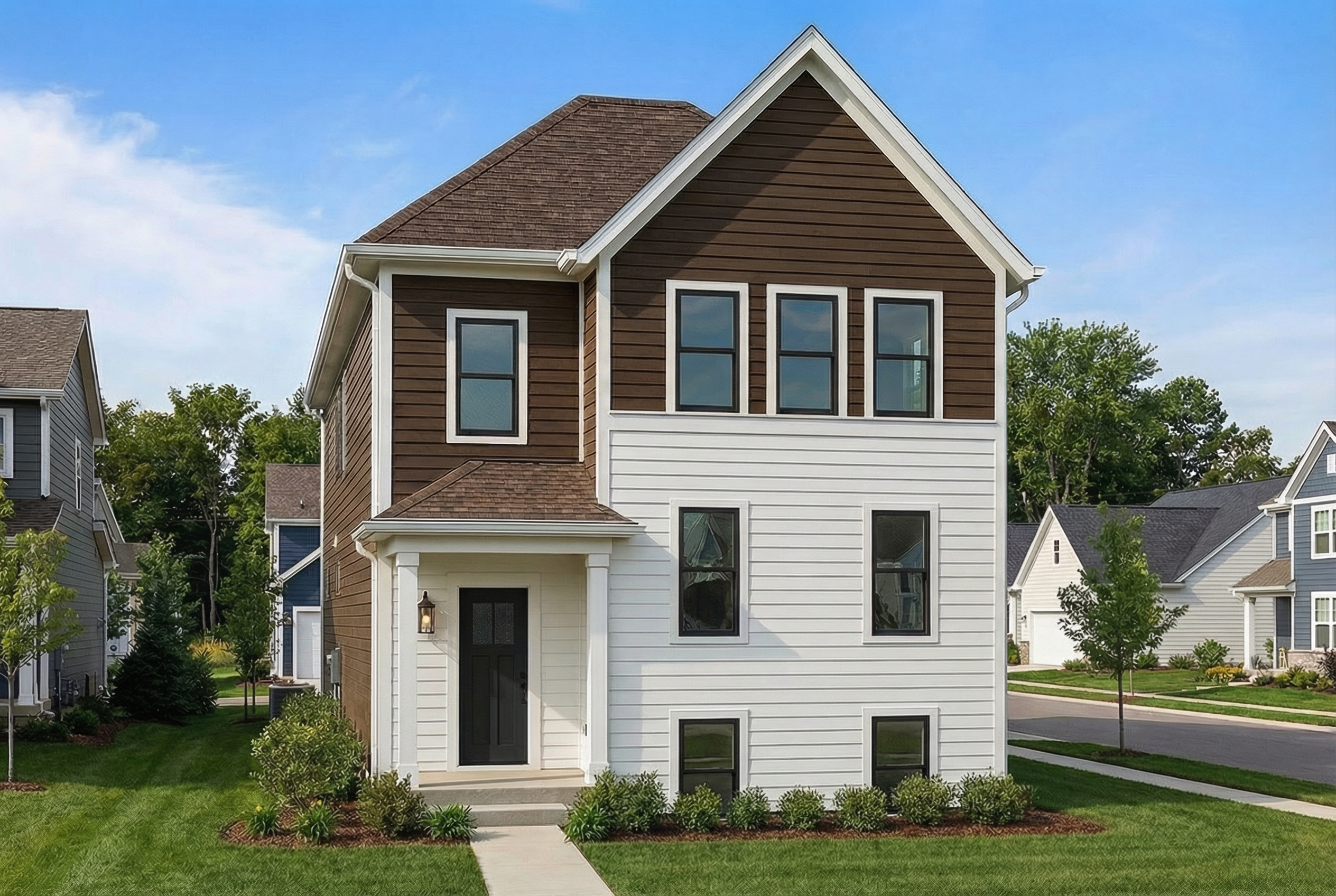 modernist exterior shot render a photorealistic 3d perspective of this house in a truckee ca reference the current material style just enhance them smooth white wall render window surrounding and keep the base course as the photo and to be dark grey stone central gables to be randomly sized dark grey stone do not change the view only enhance the current materials and make the landscape nicer vegetation detailed textures in the wood siding and glass reflections realistic grass tennis court in the same position and a vibrant clear sky with light atmospheric depth render in hyper realistic architectural visualization quality 8k resolution architecture