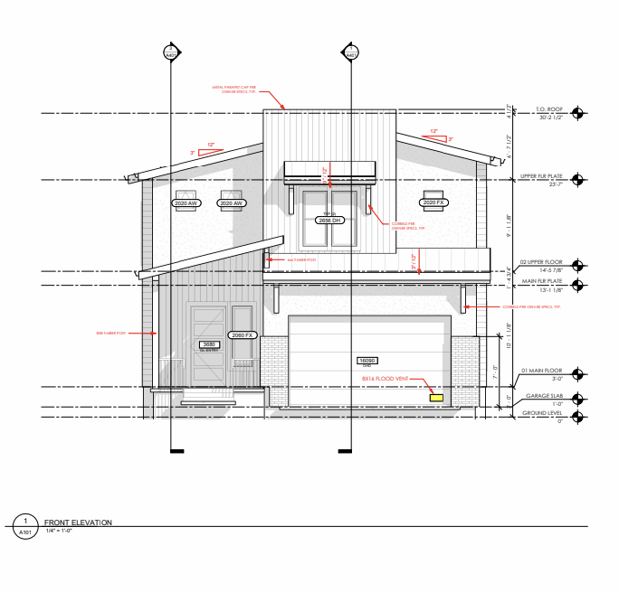 turn this drawing into a color exterior elevation picture exterior finishes should be a mix of vertical black siding brick and walnut color vertical wood siding