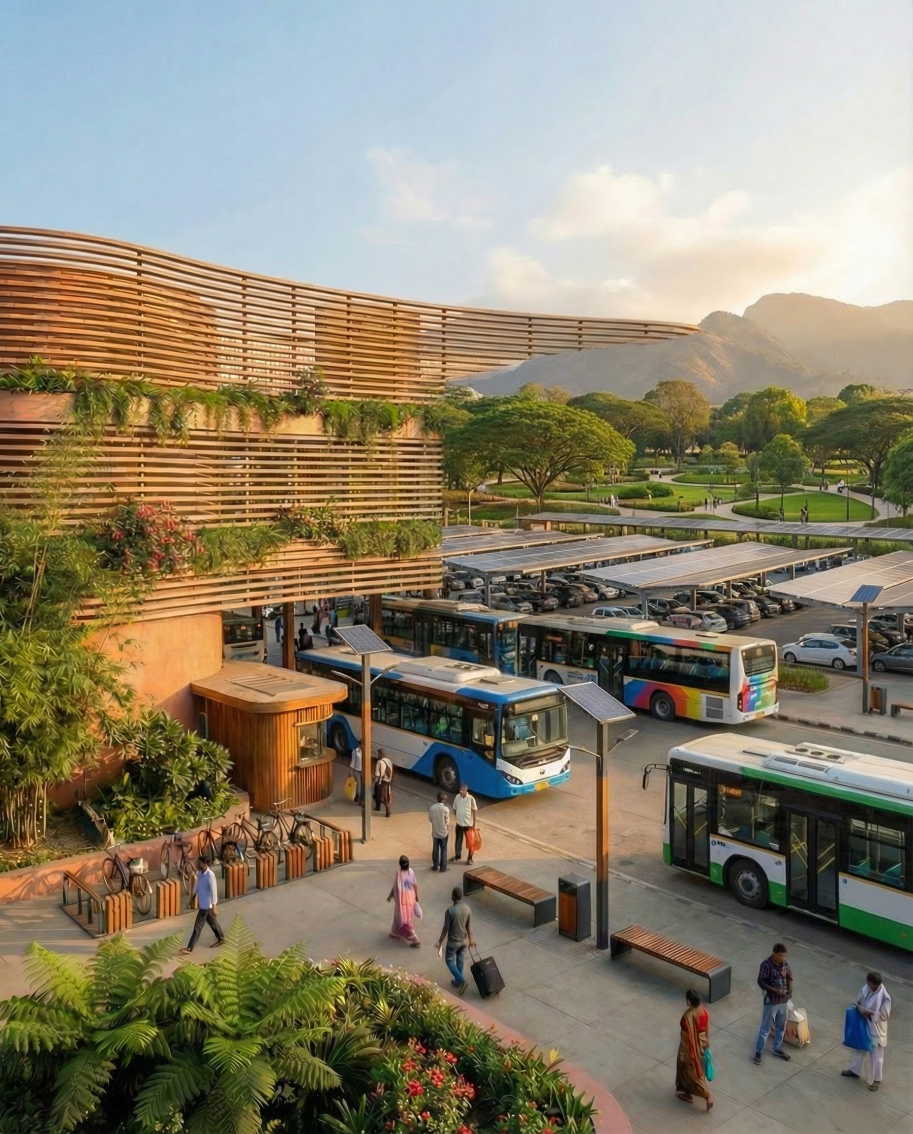 photorealistic architectural render based strictly on the provided image extend the image to the right to create additional space expand the solar panel parking area to the right increasing its capacity while keeping the same design materials and orientation move the landscaped park to the right of the expanded parking area maintaining its curving paths trees benches and green areas relocate the 10 story building so it aligns horizontally with the main frontal building placing it directly behind or slightly offset to the left of the frontal building keep the farmland visible in the far background beyond the park and buildings to preserve the rural setting and depth preserve the original lighting camera angle scale and architectural language do not introduce additional buildings urban density or new typologies