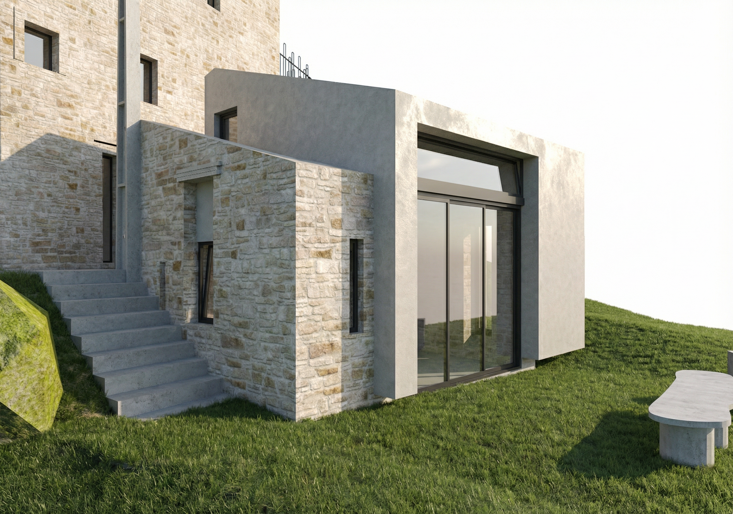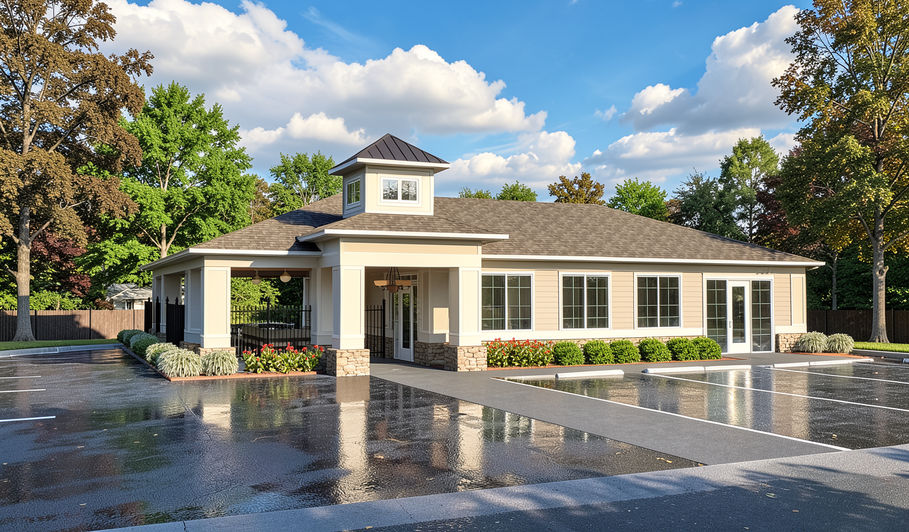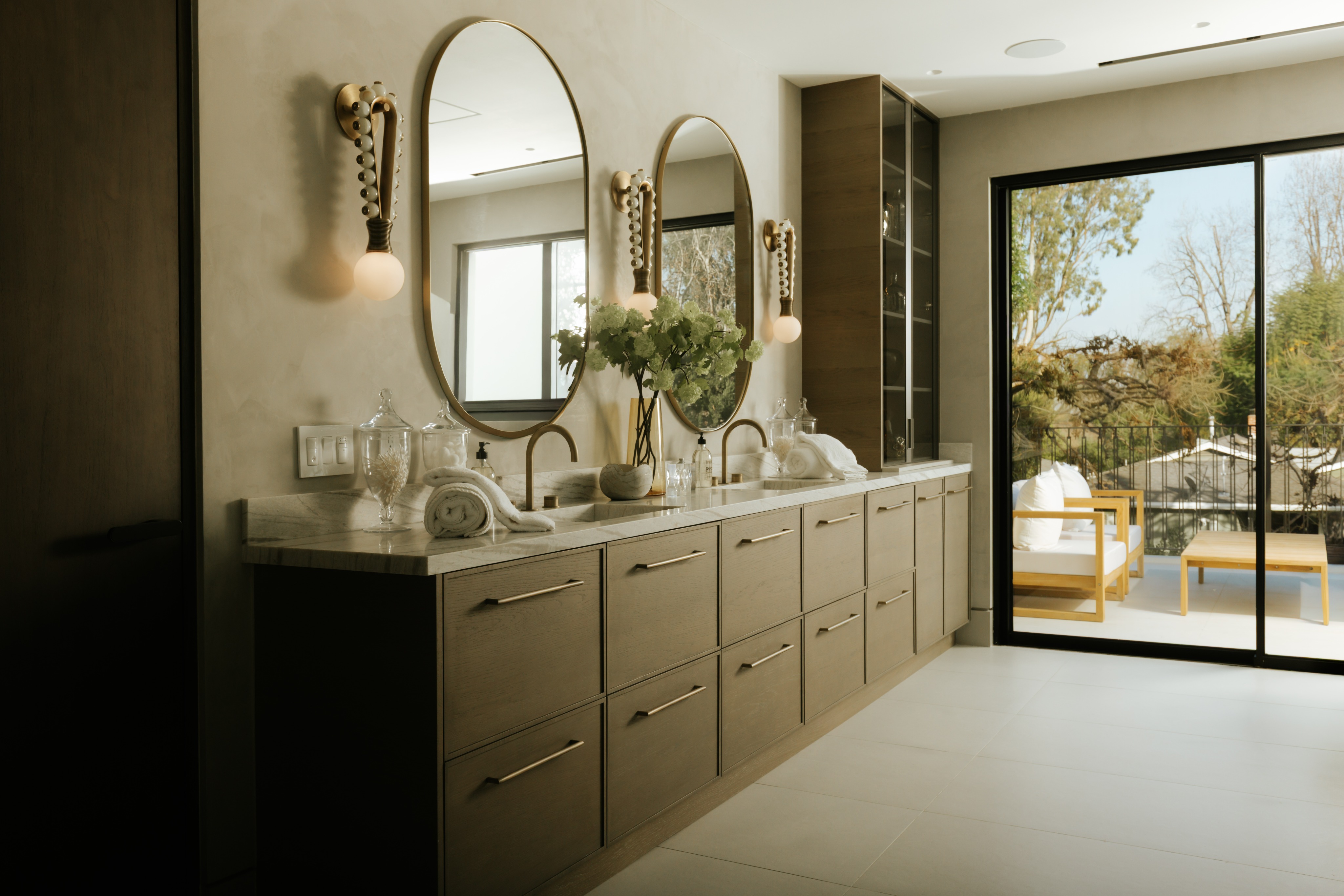 enhance this modern bathroom scene with natural balanced lighting increase overall brightness while preserving soft shadows and avoiding harsh white highlights improve the mirror reflections to clearly show the outdoor patio with depth and realism including natural sky tones and subtle environmental detail instead of blown out brightness refine the outdoor scenery to feel like a calm upscale california setting soft warm sunlight muted green trees well balanced foliage and a clean curated landscape make the greenery more elegant and cohesive avoiding messy or overly dense branches add a subtle golden hour warmth for a relaxed luxurious southern california aesthetic maintain the interior s modern design neutral tones and warm wood textures while ensuring the lighting feels airy natural and high end