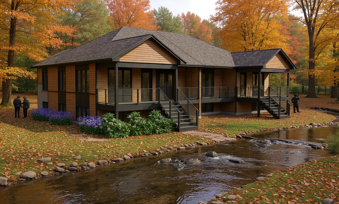 tan brick and limestone exterior base walls at second floor pass through porch at right