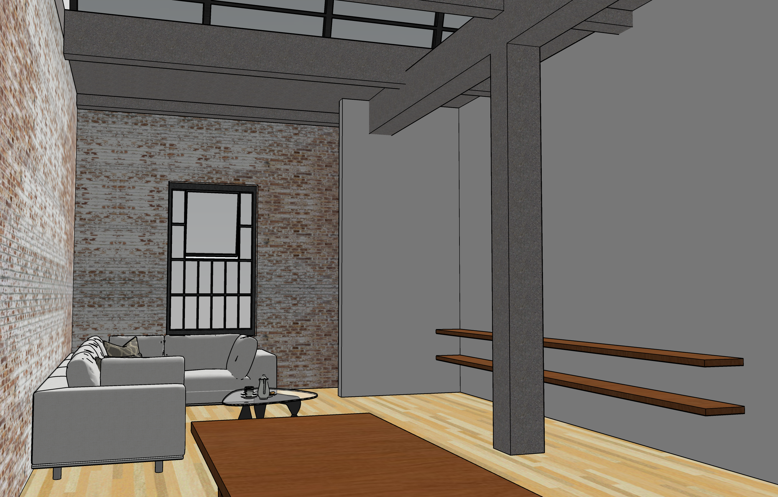 render this image to make it look real the vibe should be industrial loft but luxe the walls on the left have wood shelves that should have books on them