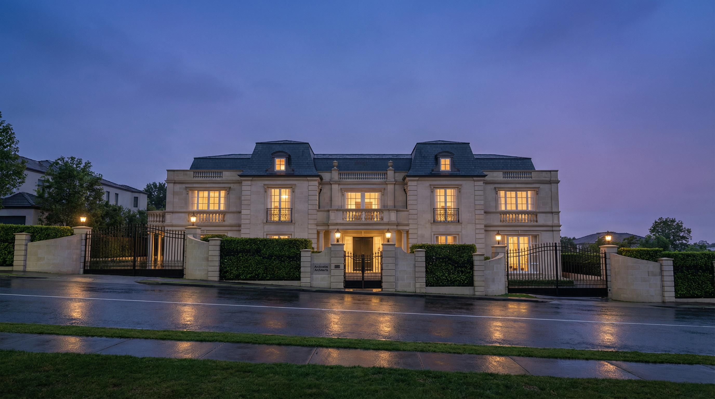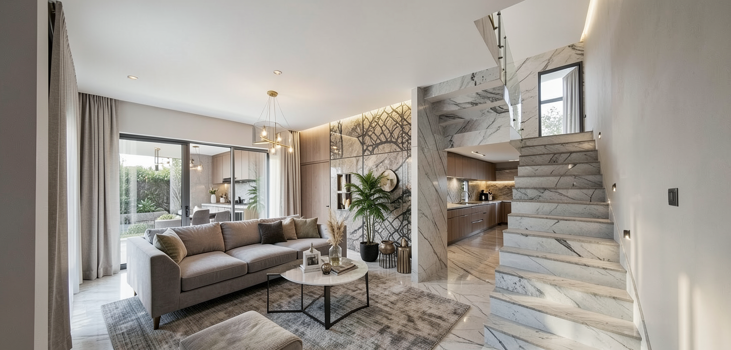 luxurious and contemporary interior of a seating space underneath a feature staircase there is a feature wall separating an open kitchen at the far end