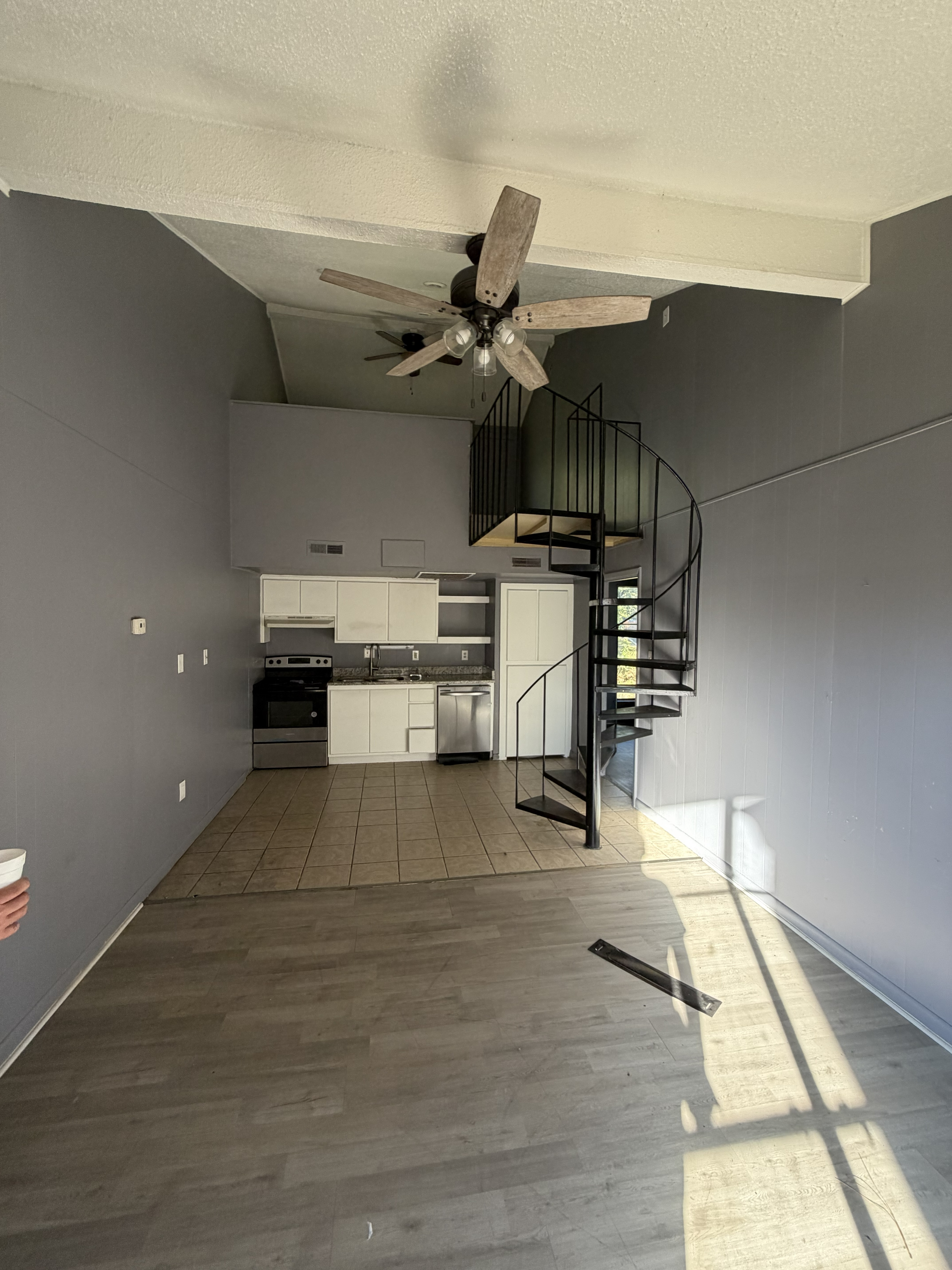keep the camera angle perspective walls windows doors spiral stair loft guardrail and lighting junctions exactly as shown do not change appliance locations except where specified design intent warm modern refresh while preserving the existing layout kitchen replace all existing cabinetry with new full overlay white shaker style base cabinets and any existing uppers only where they currently exist do not add any new wall cabinets on the wall to the left of the range hardware modern matte black linear pulls 6 8 on doors 10 12 on drawers countertops warm light to medium gray quartz subtle veining eased edge use only as countertop and short backsplash where it currently exists add a modern stainless steel wall mounted range hood centered above the existing range keep the range in place replace the tall cabinet to the right of the dishwasher with a counter depth stainless steel refrigerator in the same footprint all other appliances to be stainless steel do not move sink range dishwasher or outlets switches preserve spiral stair and loft no new uppers that interfere with vents ceiling fans replace existing fans with simple modern black ceiling fans with a small integrated light in the same locations flooring replace all visible flooring including kitchen tile with continuous warm white oak wood plank flooring matte finish long boards running the length of the space parallel to the long walls no thresholds furnishings foreground modern living area with a low profile neutral sofa light warm gray or beige simple coffee table soft textured rug clean media console and a wall mounted tv on the right wall maintain clear circulation to the spiral stair background near the kitchen compact modern dining table with 4 6 chairs wood and black metal mix walls paint keep wall ceiling geometry and openings unchanged refresh paint to a soft warm light gray or warm white crisp white trim scene requirements daylight similar to source remove all debris clutter from floors and counters high realism materials accurate reflections on stainless steel preserve proportions negative constraints do not relocate appliances except swapping the tall cabinet for the refrigerator in that same spot move lighting resize openings alter the staircase loft add islands peninsulas add ornate traditional details introduce glossy high contrast stone or add any wall cabinets to the left of the range