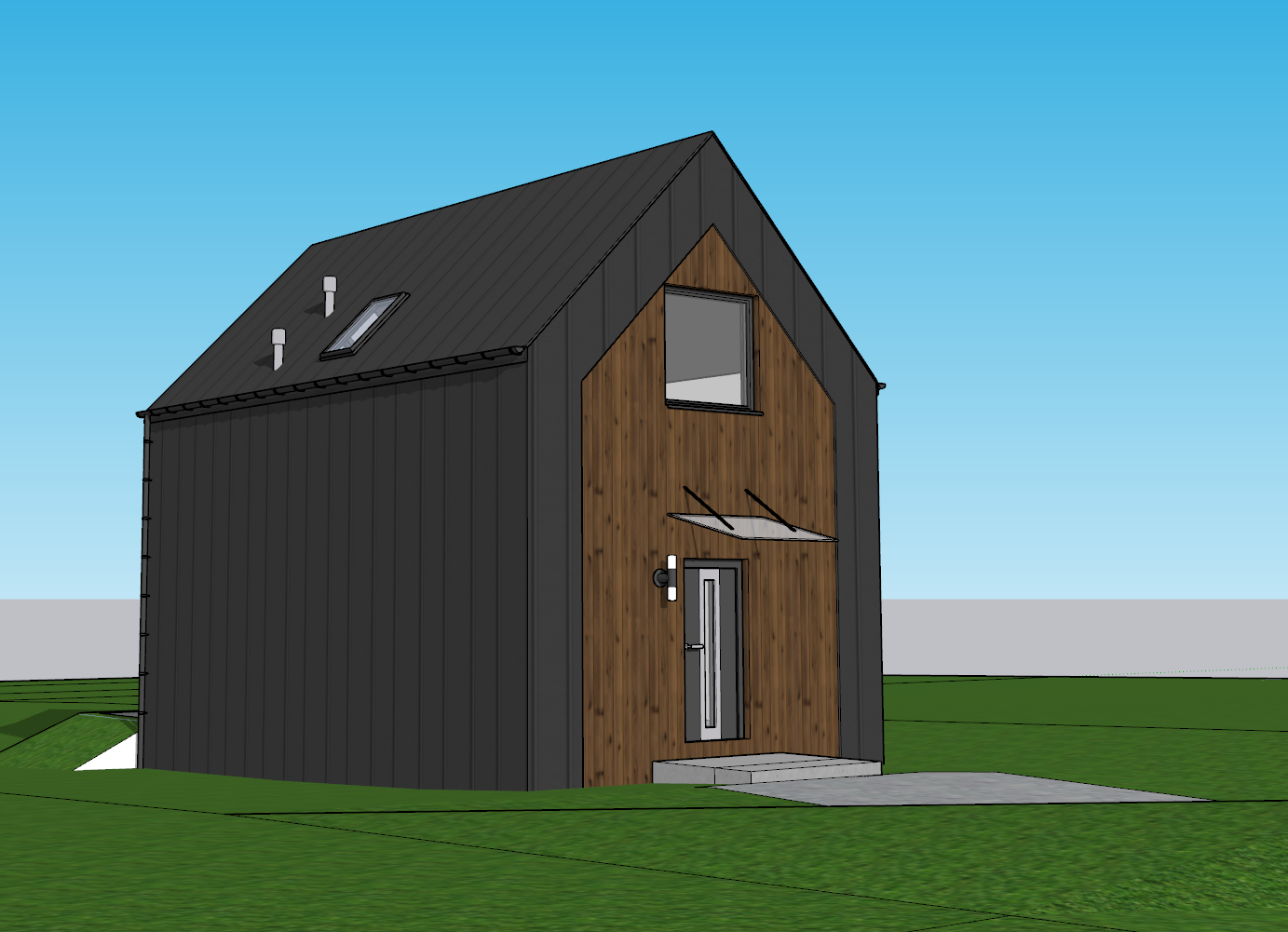 metal dark roof dark metal walls wooden walls dark windows and door courtins in windows low bushes and flowers parents with 1 kid walking on the way to entrance