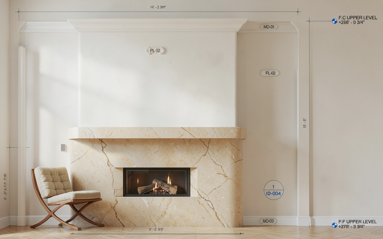 plaster on the top portion of the fireplace wall the bottom portion of the fireplace is beige marble rounded edges and interiors enclave