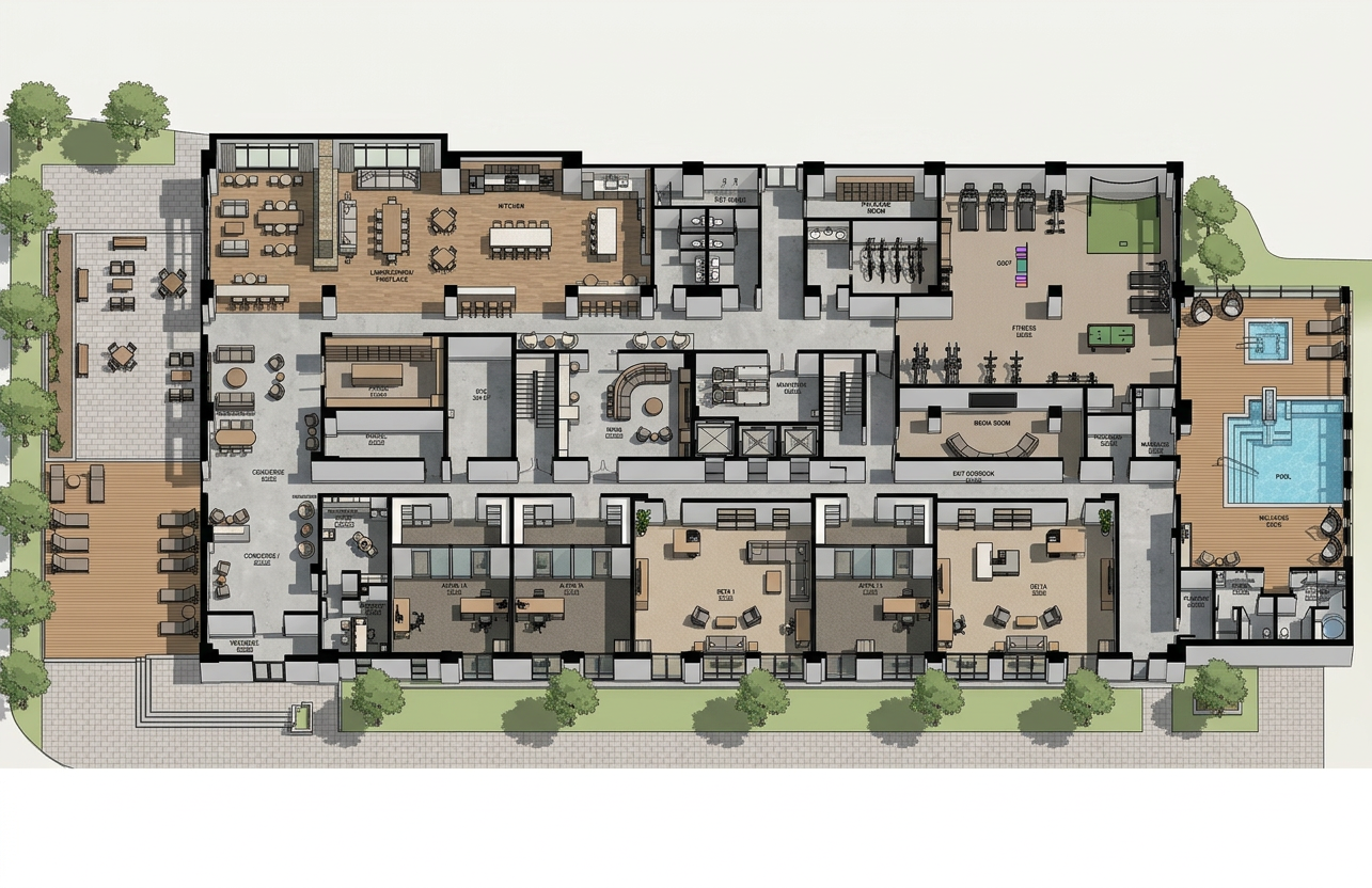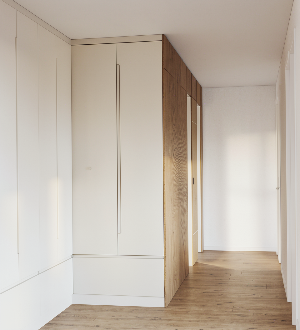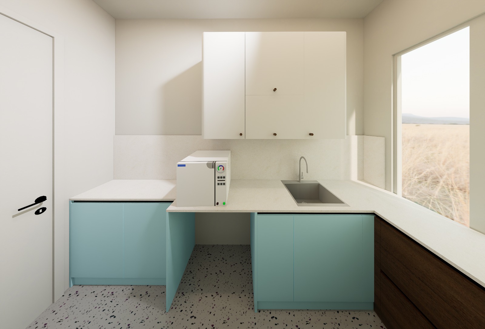 ultra realistic architectural interior render enhancement of this compact minimalist kitchen preserving the exact original design layout proportions camera angle composition cabinetry arrangement countertop geometry sink position window size door placement and overall spatial structure do not redesign do not restyle do not add or remove furniture or architectural elements except for the requested window treatment keep all materials exactly as in the input image unless specified maintain the lower blue cabinetry exactly in ncs s 1015 b20g with a smooth matte lacquer finish soft realistic reflections subtle micro texture and clean sharp edges keep the dark wood cabinetry on the right side unchanged in tone and material with realistic wood grain depth and natural satin finish keep the upper cabinets in the same warm off white tone and minimal flat panel appearance keep the terrazzo tile floor exactly as terrazzo preserving its chip pattern scale and light base tone only making it more physically realistic with accurate texture depth fine surface variation and believable light response keep the countertop and backsplash in the same light solid surface stone appearance with refined realism subtle roughness variation crisp edges and natural shadow transitions preserve the sink and faucet design exactly keep the microwave autoclave unit in the same position and same design language only improving realism and material accuracy add venetian blinds on the window minimal and elegant fitting naturally within the existing window frame with realistic slat proportions soft daylight filtering and subtle shadow lines cast into the room the blinds must feel integrated and architectural without changing the design of the space enhance the render to look photorealistic and high end with realistic global illumination natural daylight entering from the right window soft bounce light accurate ambient occlusion subtle contact shadows realistic highlight control and cinematic but natural exposure improve material realism through fine imperfections micro surface variation realistic edge definition and physically accurate reflections while keeping the scene clean and minimal preserve the bright soft warm neutral atmosphere of the original image make it look like a real professionally photographed interior ultra detailed crisp believable and premium negative instructions do not change cabinet colors do not change materials do not change layout or design do not move objects do not add decorative objects do not alter terrazzo pattern do not replace the countertop or backsplash do not change camera angle or composition do not oversaturate do not make it stylized or cgi looking avoid plastic looking surfaces blurry edges overexposed window light or unrealistic reflections